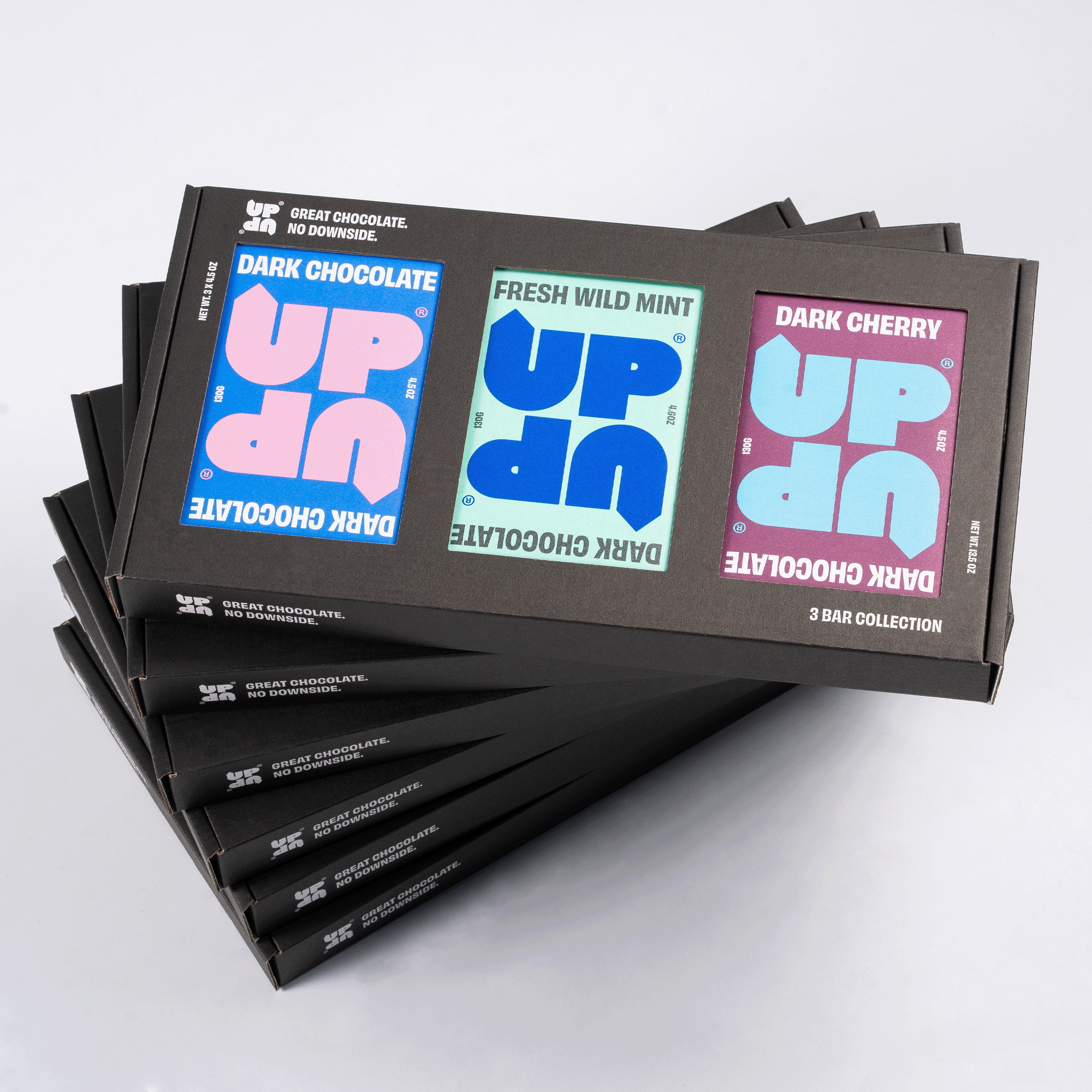 The UP-UP Dark Chocolate Trio showcases three of our most beloved bars. Each bar is made with Single Estate 50% cacao sourced from ‘El Rosario', a farm in Colombia’s Necocli region. These bars offer distinctive cacao notes, a balanced blend of sweetness and bitterness, nutty flavours reminiscent of caramelised hazelnuts, and a delightful finish featuring hints of dried fruit and citric acidity, pairing with fresh mint and cherry flavours.