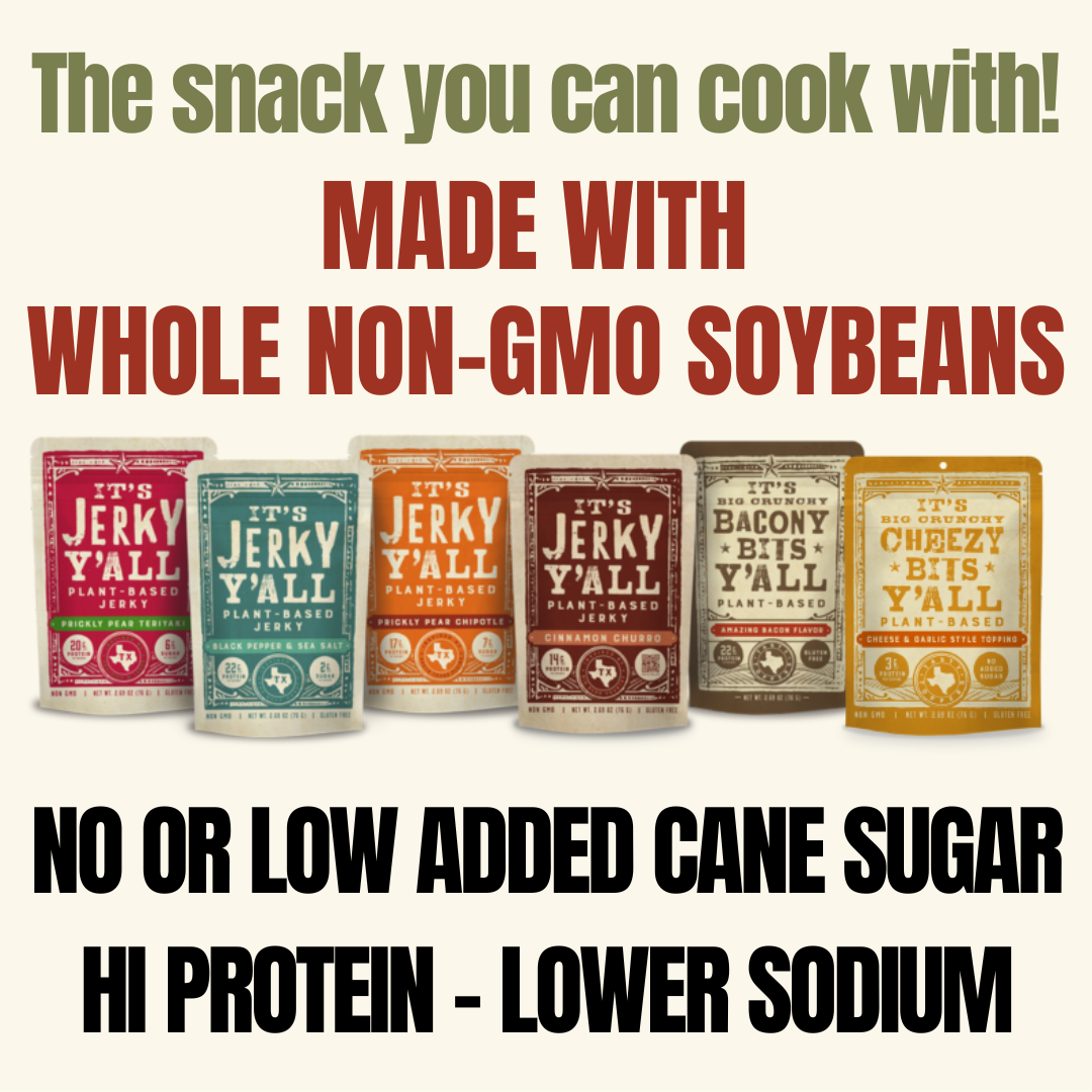 Prickly Pear Teriyaki Jerky – A Sweet, Savory, and Plant-Based Snack! Our Prickly Pear Teriyaki Jerky combines the sweetness of prickly pear with the umami of teriyaki, inspired by the Texas Prairies & Lakes. This plant-based jerky offers 20g of protein per bag, perfect for snacking or adding to salads, stir-fries, and sandwiches. It's gluten-free, non-GMO, and free from additives, making it one of the best vegan snacks to buy. Why Choose Our Prickly Pear Teriyaki Jerky? * 100% plant-based, delivering sweet and savory flavors * Packed with 16g of protein per bag * Low in sugar and sodium * Certified Gluten-free, non-GMO made from whole soybeans * Convenient 2.69oz resealable bag