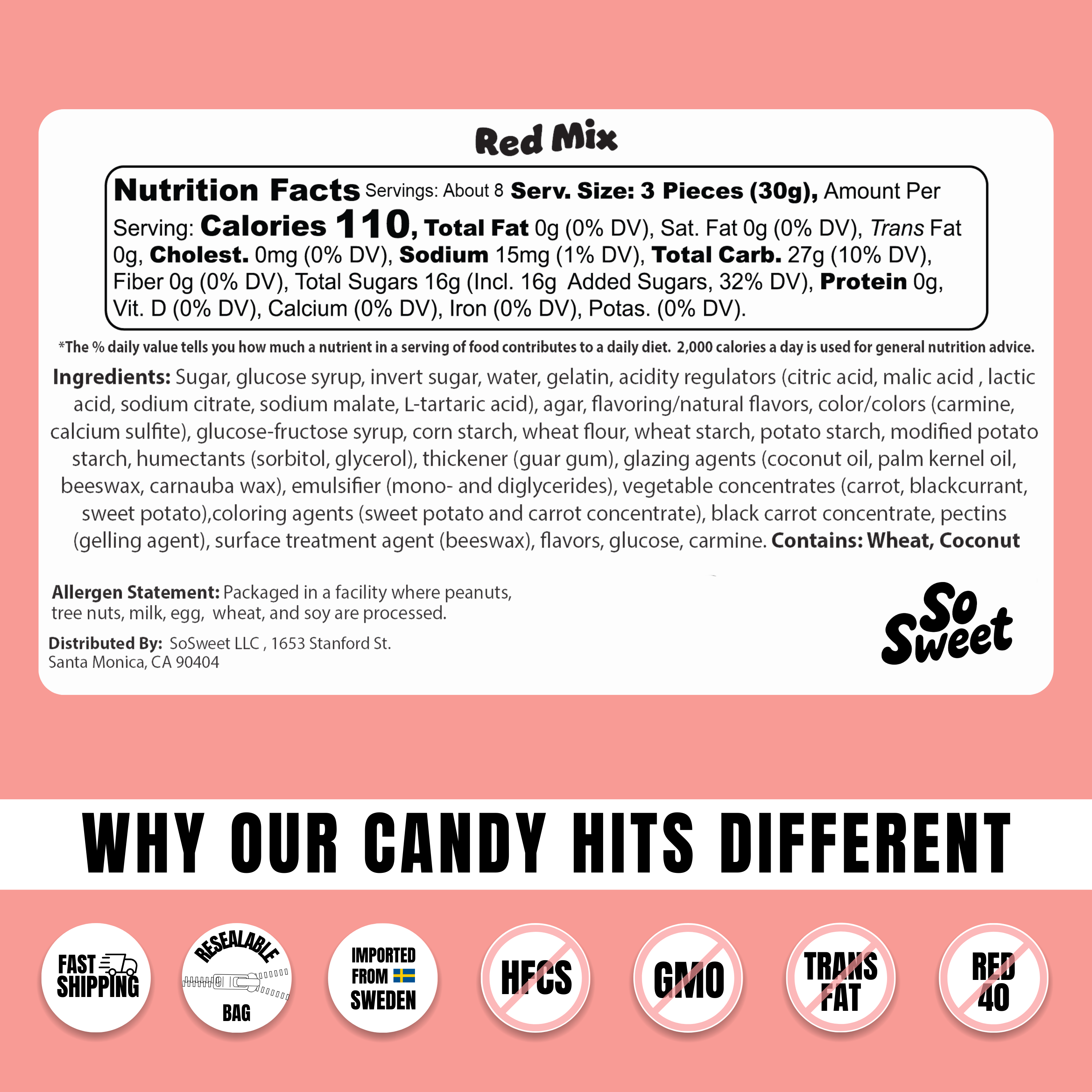 Get ready for a bold burst of berry flavor with our vibrant Swedish Candy Red Mix! Packed with classic red favorites like juicy strawberry, tangy raspberry, and sweet cherry, this mix delivers a perfect balance of sour, chewy, and soft textures. Every bite is a nostalgic throwback with a Scandinavian twist. A must-have for red candy lovers!