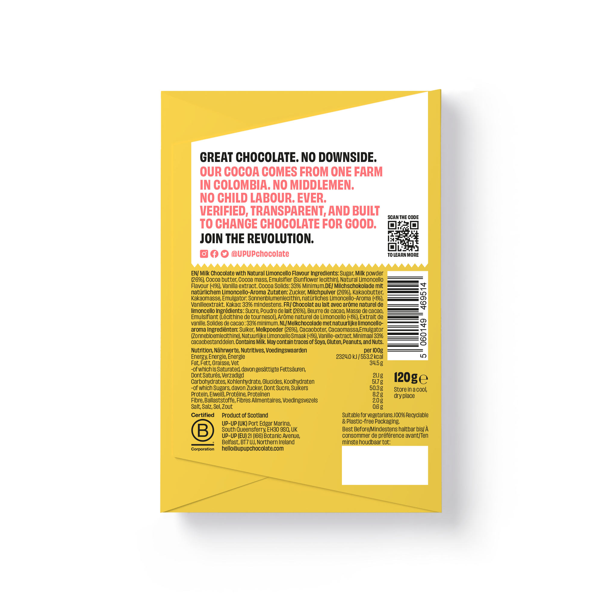 UP-UP Limoncello Chocolate is inspired by Italy’s beloved liqueur. Crafted with Single Estate 35% cacao from fine flavour cocoa beans grown at the renowned "El Rosario" farm in Colombia’s Necoclí region, this bar is infused with the vibrant zest of limoncello flavour. The result is a delightful blend of creamy sweetness and refreshing citrus notes, offering a perfectly balanced and taste of sunshine in every bite. Ingredients: Sugar, milk powder (26%), cocoa butter, cocoa mass, emulsifier: sunflower lecithin, Natural Limoncello Flavour (<1%), vanilla extract. Allergens: Contains Milk. May contain: soya, gluten, peanuts and nuts.
