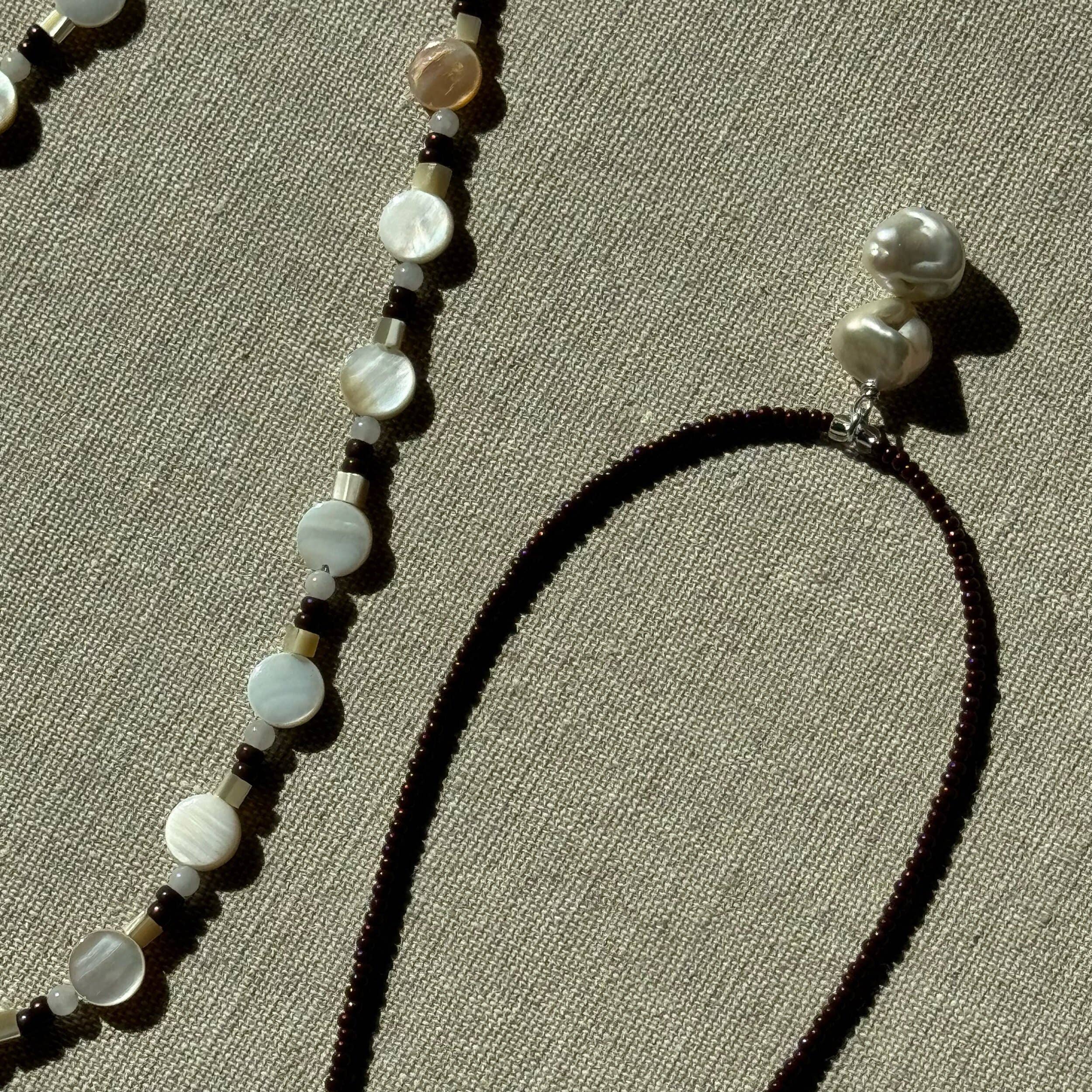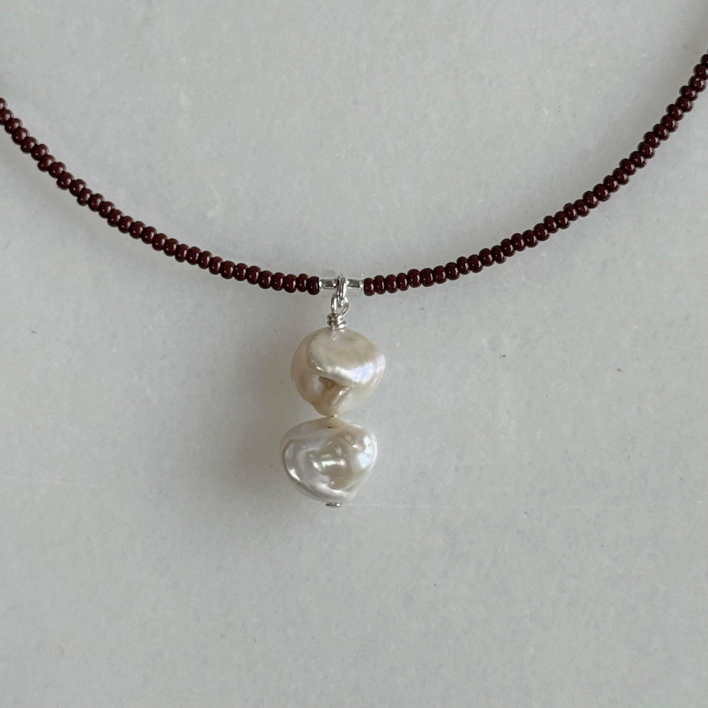 Pearl drop necklace Classic claw closure Available in 16”/18”/20” lengths Handmade. Materials: Freshwater cultured pearl pendant Espresso brown Japanese seed beads Wire cord with sterling silver hardware.