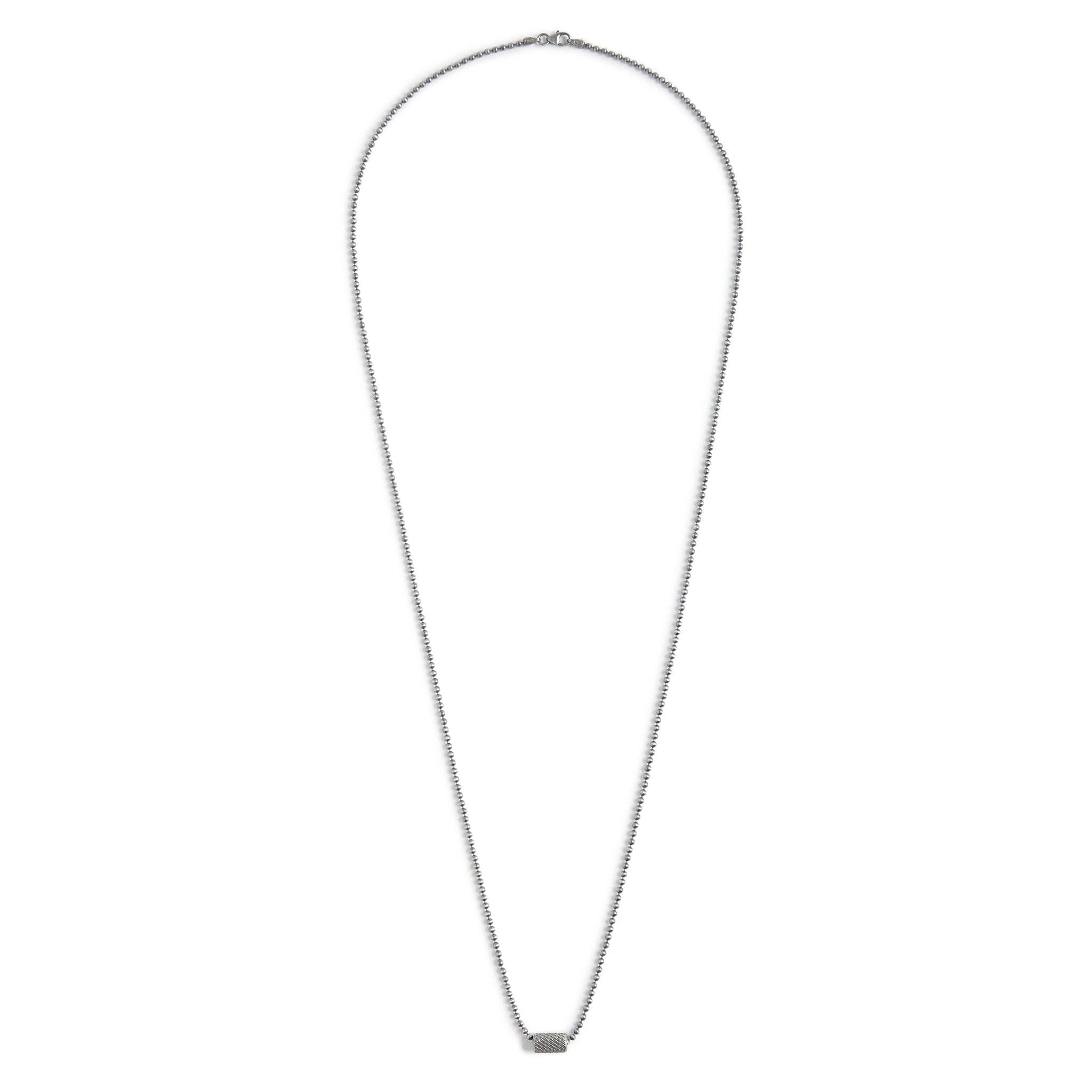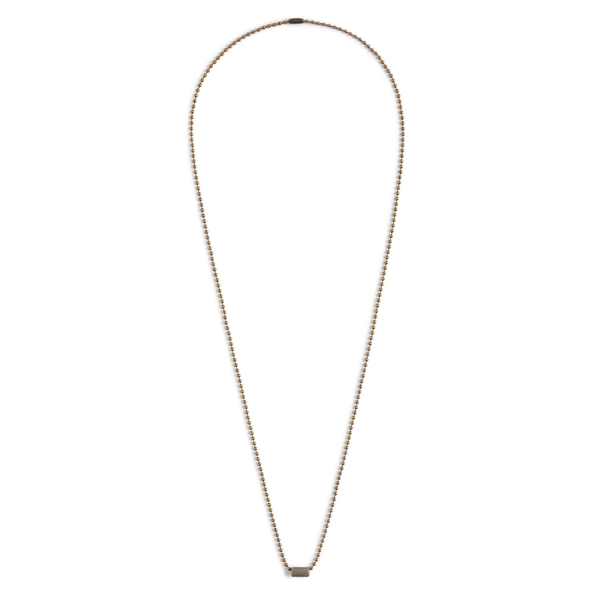 Solid ball chain with knurled texture bead. Available in solid brass or .925 sterling silver. Our uncoated and unpolished 'work patina' will evolve over time with the wearer. * 30" brass ball chain, bead measures 11mm long, 6mm thick. * Shipping & Customs Info