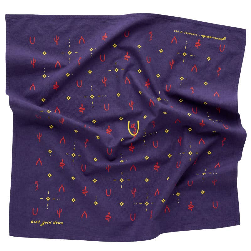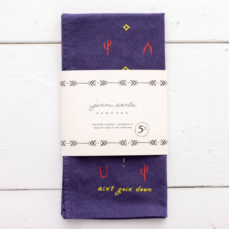 Made in the Southern USA with the mantra “ain't goin down” on one corner. SO many uses for a great quality bandana! from hiking, doggy beautification, camping and yoga, gardening, and just some gorgeous, on trend, western style! these bandanas also make excellent christmas / holiday gifts as each one comes with it's own hit of encouragement and inspiration. We make these bandana scarves to be used as talismans to help us remember everyday that we are so much stronger and more capable than we know. Approx. 21"X21" 100% southern grown + milled cotton Machine wash cold © Jenni Earle 2024