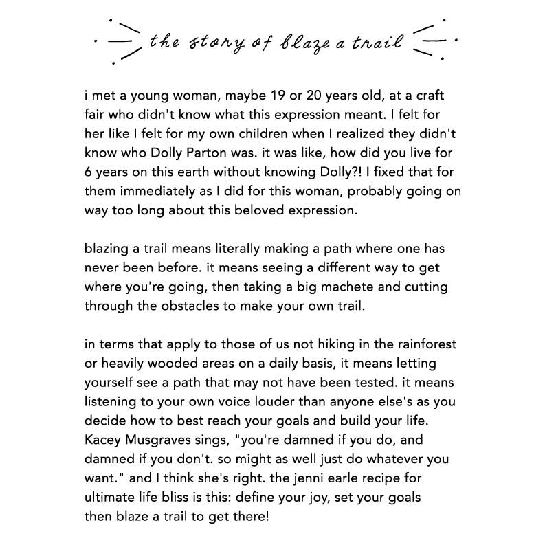 Made in the Southern USA with the mantra “blaze a trail” on one corner. SO many uses for a great quality bandana with summer coming up! from hiking, doggy beautification, camping and yoga to beach accessories, gardening, and just some gorgeous, on trend, western style! just pop it around your neck or tie on your tote bags. these bandanas also make excellent graduation gifts as each one comes with it's own hit of encouragement and inspiration. We make these bandanas to be used as talismans to help us remember everyday that we are so much stronger and more capable than we know. Approx. 21"X21" 100% southern grown + milled cotton Machine wash cold © Jenni Earle 2024