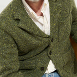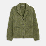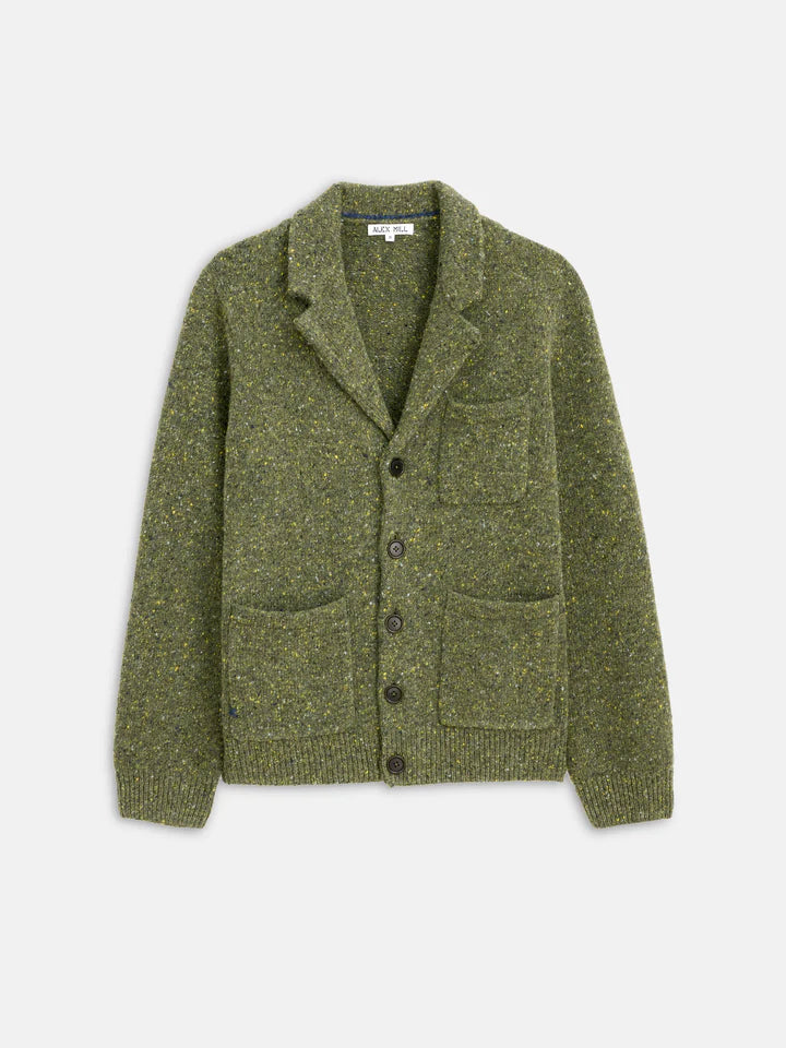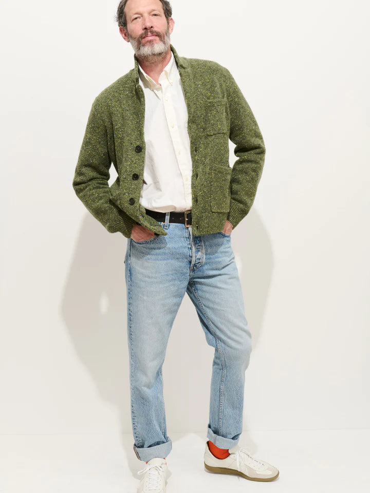 Details we love: Notch collar, real corozo buttons, and contrast chain stitch on the inside, donegal wool blend, finished with fine ribbing.