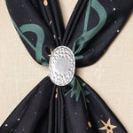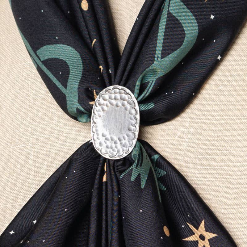 Handmade in abilene, texas 100% brass this hand-crafted silver oval is a one-of-a-kind bandana slide that brings some serious moxie to your bandana style. a perfect accessory to offer in your store, the bandana slide... so many uses! summer hiking, pet adornment, camping, yoga, gardening, and just some gorgeous, on trend, western style!