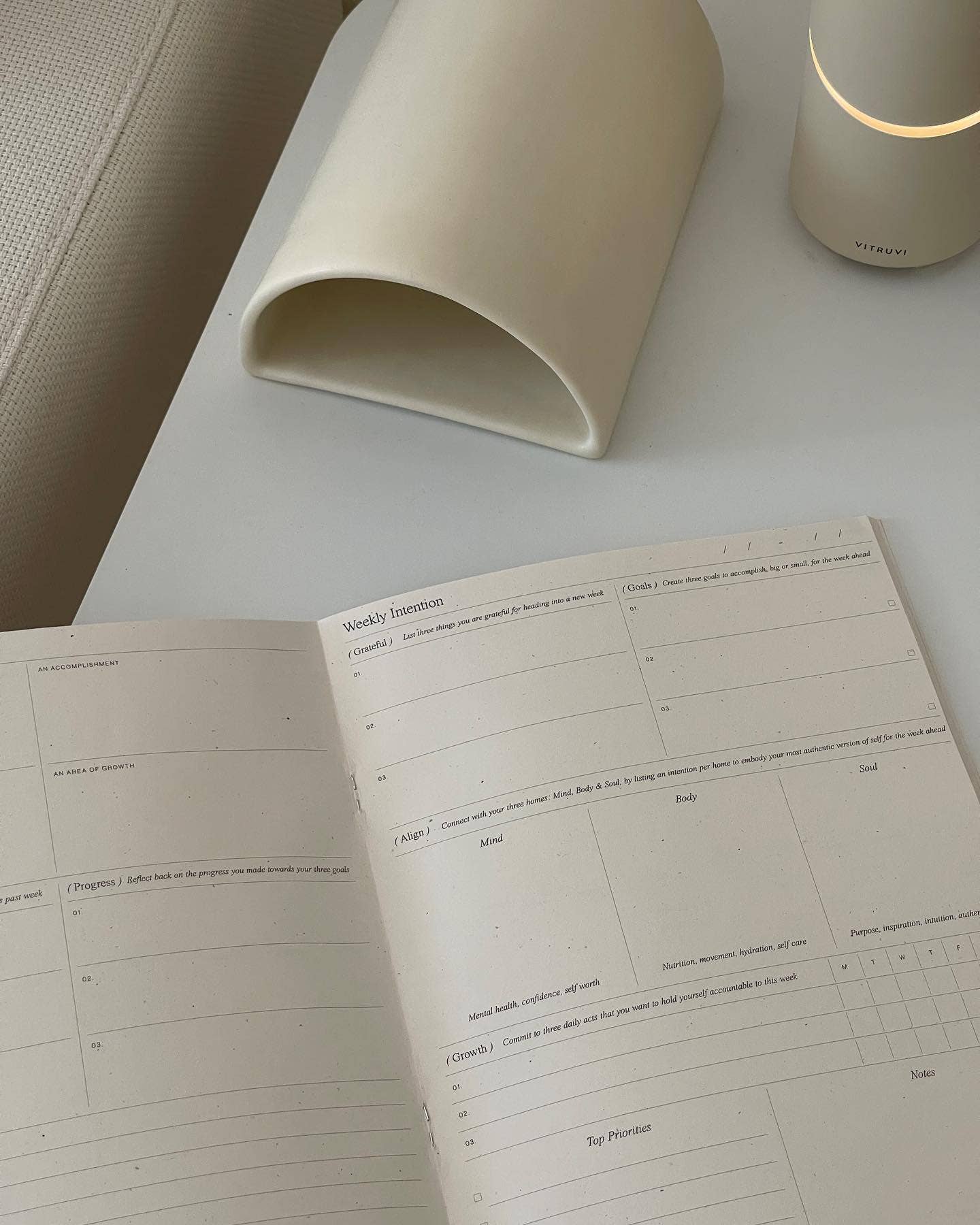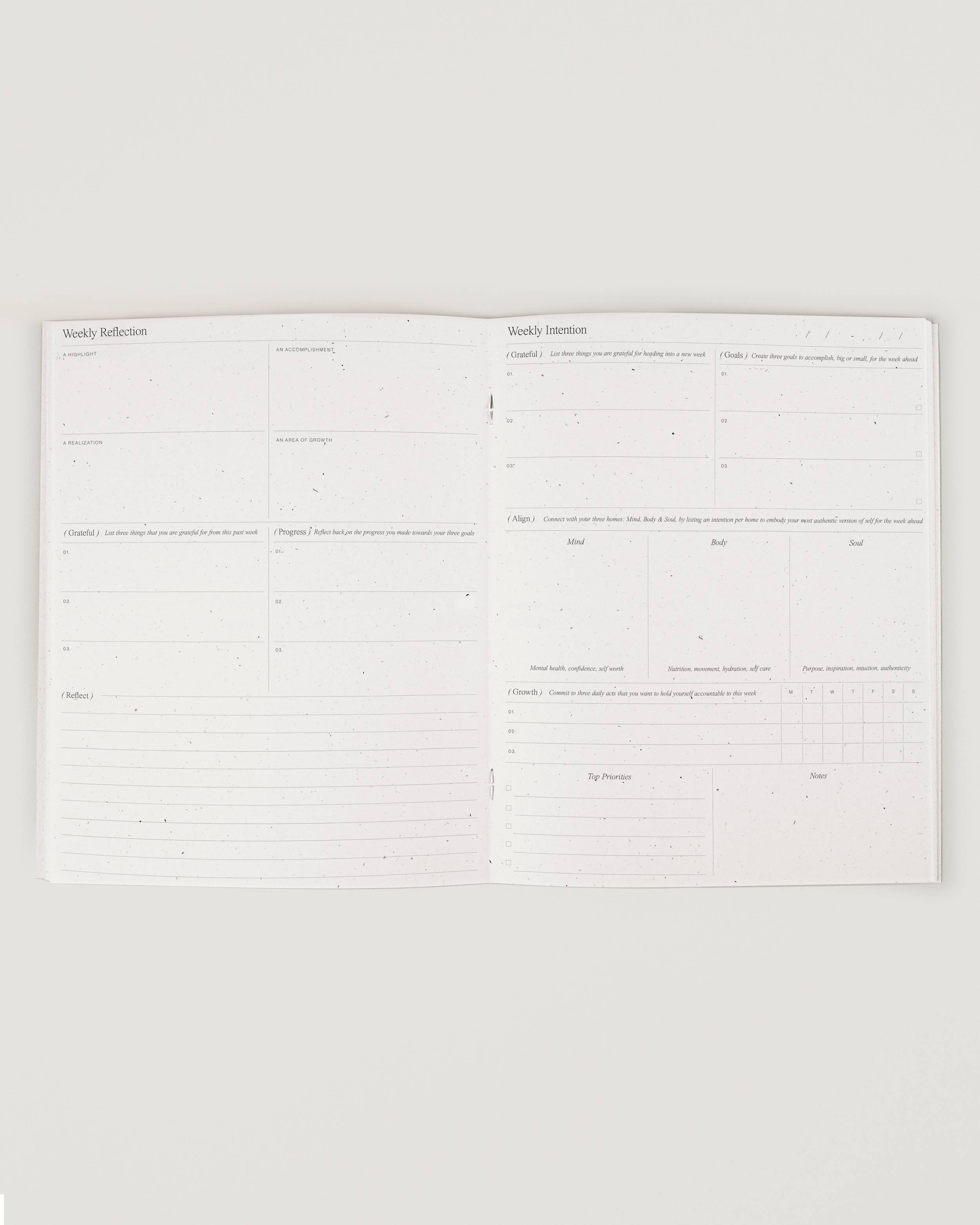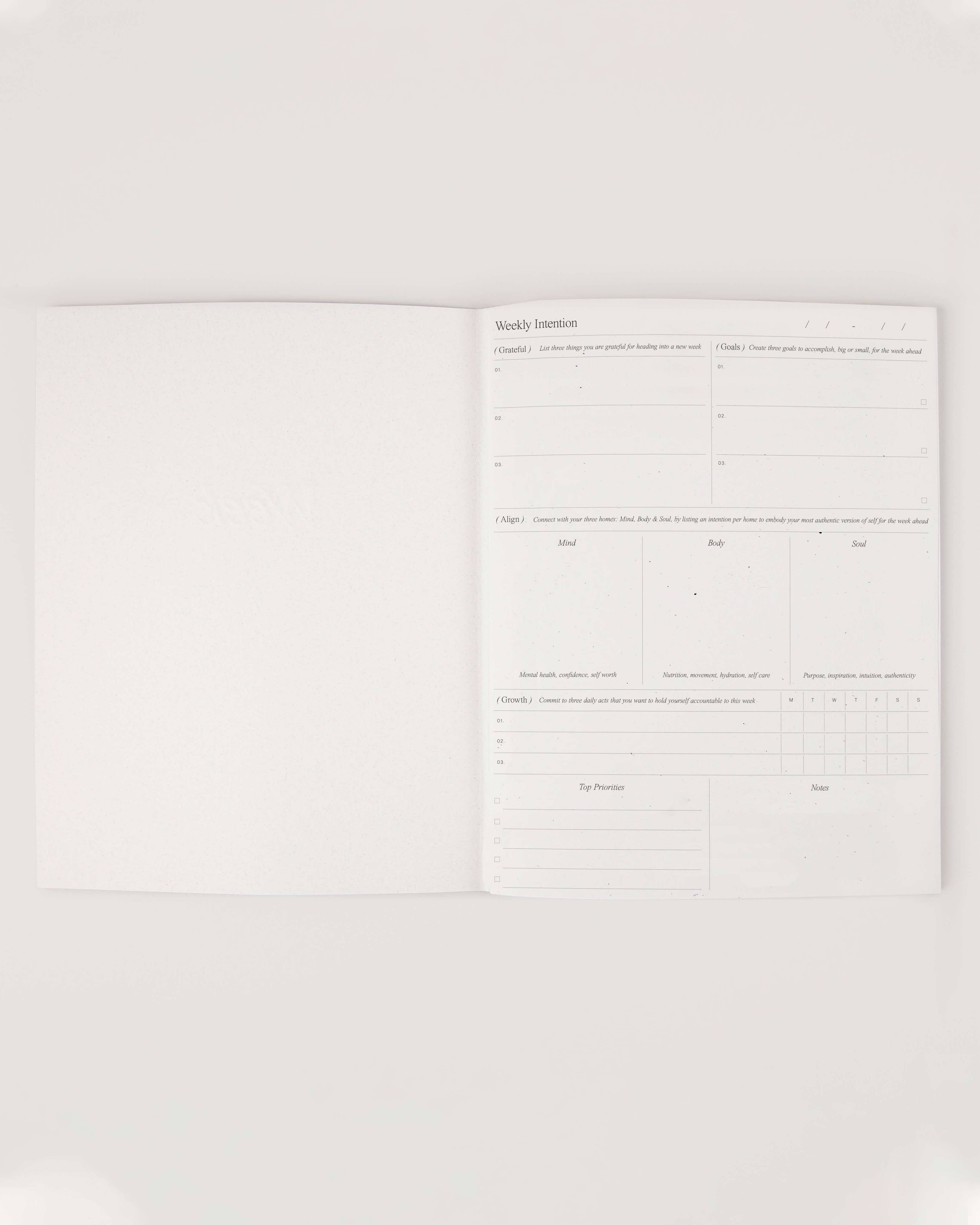 – Weekly Intention Page: Set goals, create wellness intentions, track your growth and define your priorities for the week ahead