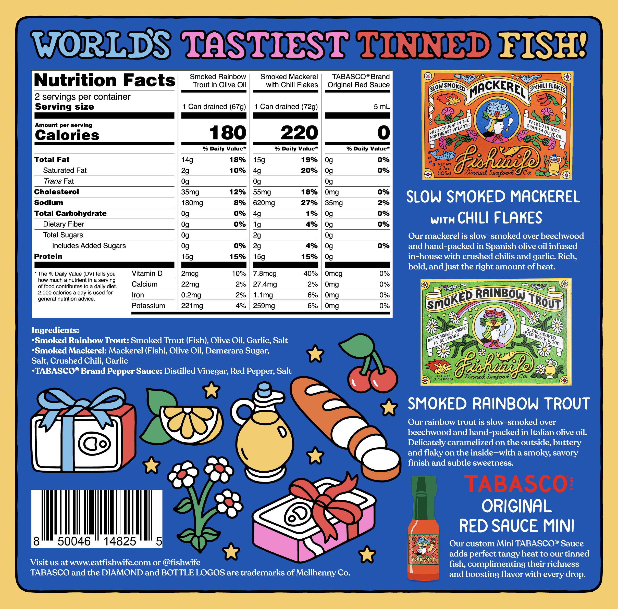 Meet the Tinned Fish Gift Set! Inside you’ll find two Fishwife favorites: Smoked Mackerel with Chili Flakes and Smoked Rainbow Trout, plus our custom Fishwife x Tabasco® Mini Hot Sauce. It’s the perfect trio of bold tins with a fiery little sidekick to match. Whether you’re gifting a friend, thanking a host, or treating yourself, this set packs big flavor into a small box. Our mackerel is slow-smoked over beechwood and hand-packed in Spanish olive oil infused in-house with crushed chilis and garlic. Rich, bold, and just the right amount of heat. Our rainbow trout is slow-smoked over beechwood and hand-packed in Italian olive oil. Delicately caramelized on the outside, buttery and flaky on the inside—with a smoky, savory finish and subtle sweetness. Our custom Mini TABASCO® adds perfect tangy heat to our tinned fish, complimenting their richness and boosting flavor with every drop. Comes in set of 6