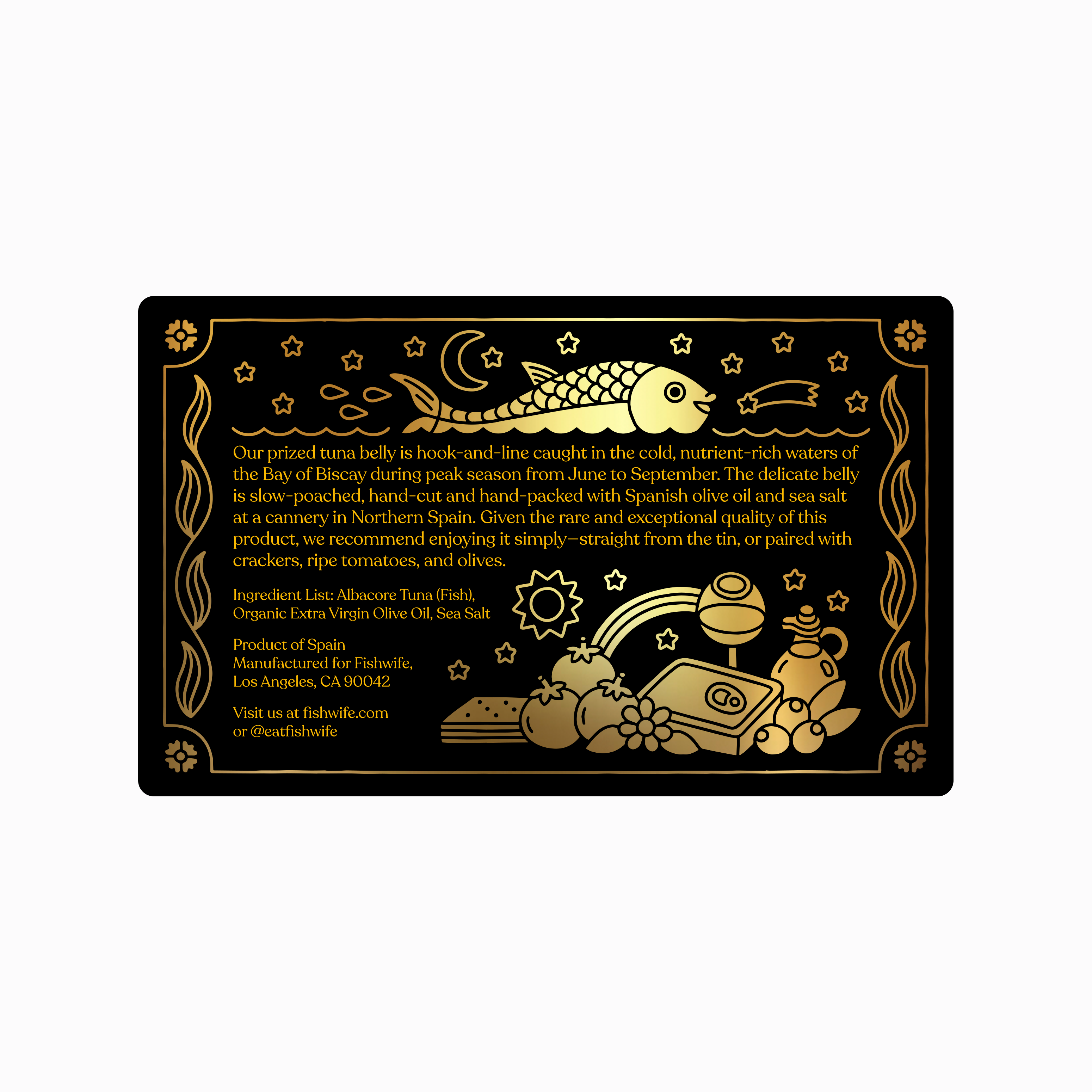 Meet the most luxurious tin we have ever launched. Tuna Belly (also known as Ventresca) is the tender, buttery belly cut of albacore tuna, the most prized part of the fish and what we call the wagyu of the sea. Each tin takes 37 minutes to make, resulting in a silky, melt-in-your-mouth bite that feels indulgent and unforgettable. Only about 6 percent of the fish is belly, making this tin a rare treasure meant to be savored slowly and shared with love. - **Wild-Caught in the Bay of Biscay**: This prized tuna belly (ventresca) is sourced from the cold, nutrient-rich waters of the Bay of Biscay, known for producing some of the world’s highest-quality tuna. - **Line-Caught, One by One**: Each tuna is caught individually using traditional pole-and-line methods, a time-honored, sustainable practice passed down through generations of Basque fishermen. This selective method ensures the quality of each catch and minimizes by catch, preserving marine biodiversity. **Culinary Versatility:** - Melts in your mouth text