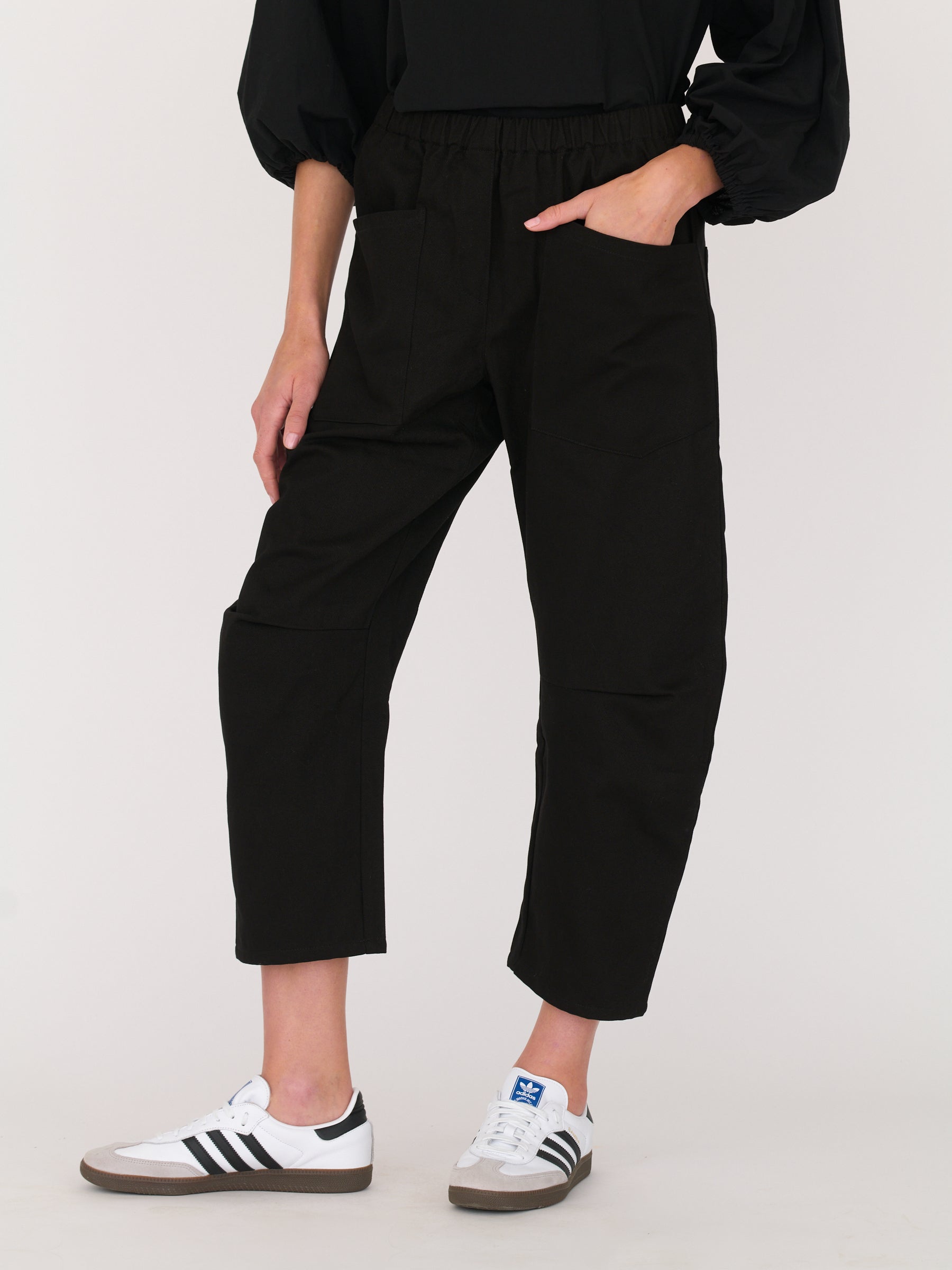 Designed with an easy elastic waistband, relaxed curved leg, and oversized patch pockets that lend a modern, utilitarian edge.  Effortless, versatile, endlessly wearable.