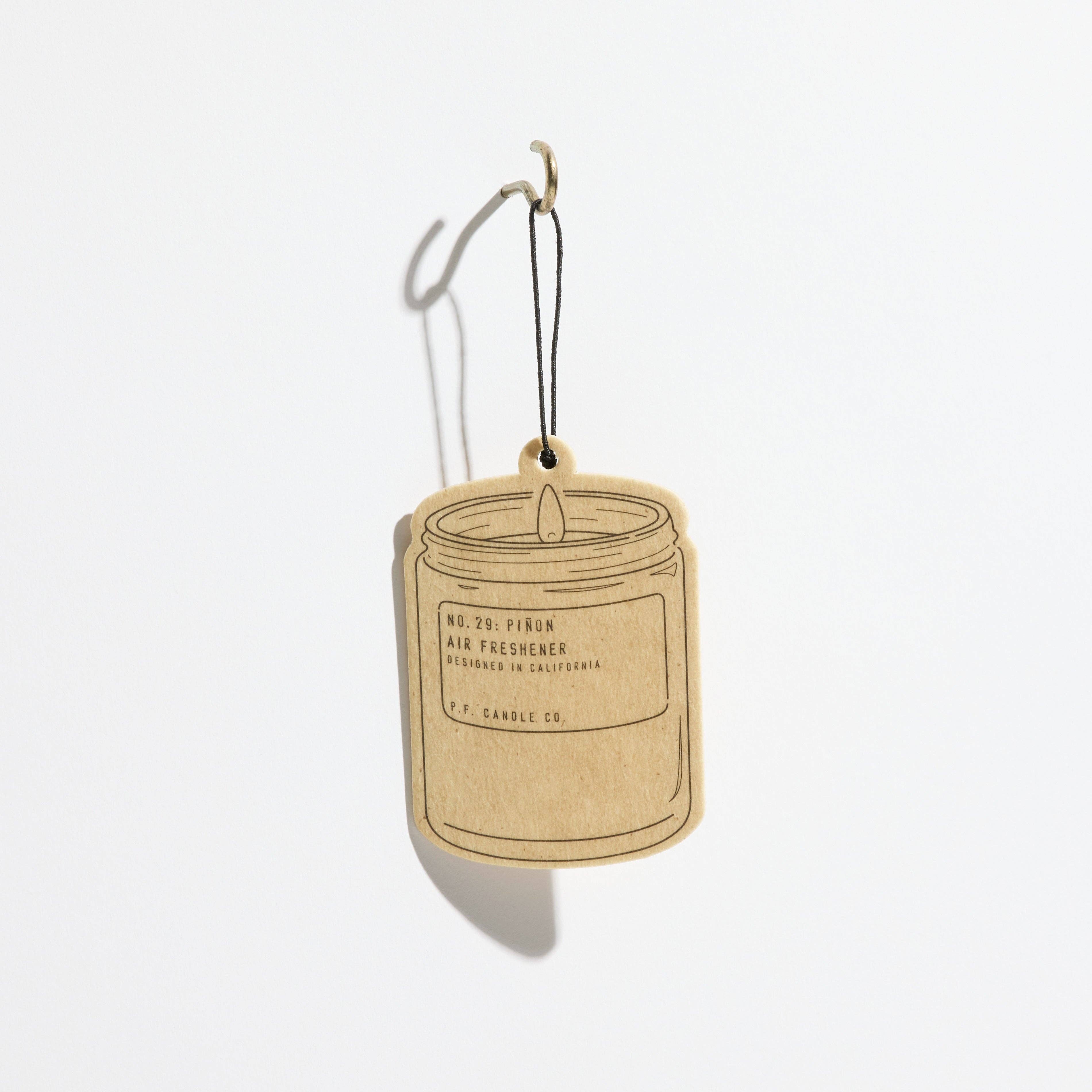 Winters in the Southwest, lingering bonfires, wool jackets in rotation. Notes of piñon logs, cedar, and vanilla. Introducing Air Fresheners: a flame-free collection designed to scent small spaces, like closets, bathrooms, gym lockers, trash cans, hotel rooms, and anywhere else that needs a little fragrance boost. Air Fresheners are pre-packed in pairs, featuring an iconic P.F. Candle-shape and signature kraft paper look.