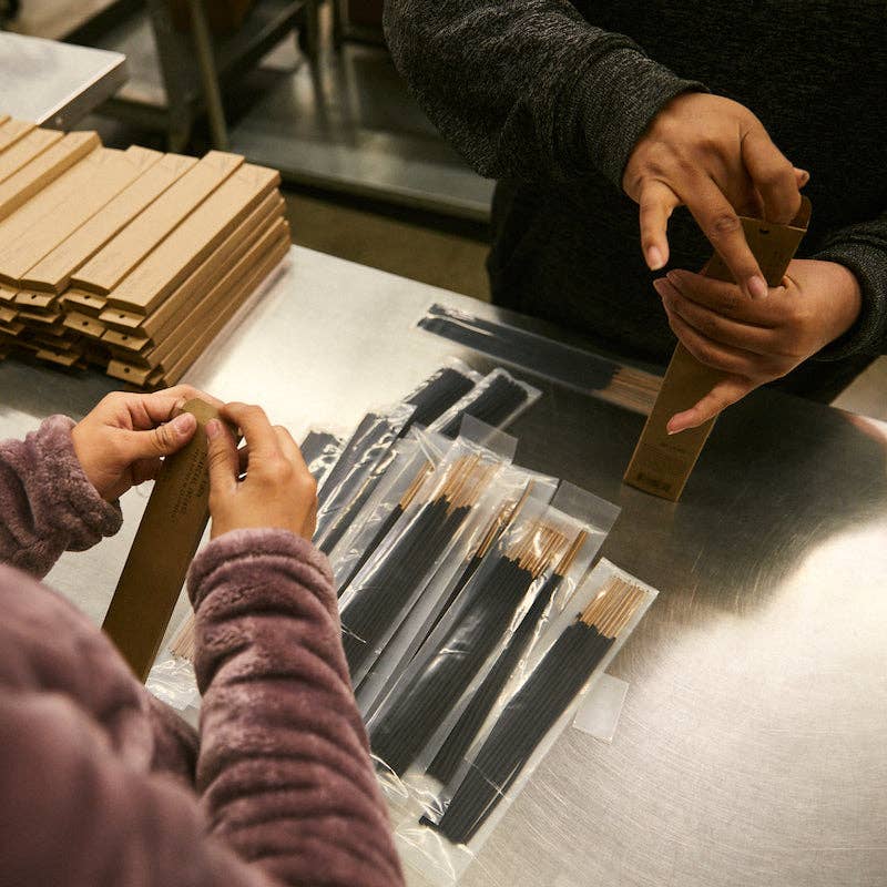 Barefoot walks through wild herb gardens, cool mountain stream baths, crisp morning air. Aromatic, camphorous, earthy. Notes of lemon balm, crushed thyme, orange rind, and fir. Incense quickly transforms a room: transformative smoke uplifts the space while our signature scents linger for hours even after extinguishing. Our charcoal-based Incense is hand-dipped in-house using fine fragrance oils and dipropylene glycol (DPG), a synthetic base commonly found in body care and home fragrance products. Each stick burns for 1 hour; depending on room size, scent longevity lasts between 2-4 hours. 15 sticks in each kraft package, measuring 10.75" long each. Your customers might also like sweet Amber & Moss or fresh Ojai Lavender.