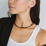 A textured necklace strung with dark translucent smoky quartz beads. The thoughtful mix of different sizes create a unique finish.