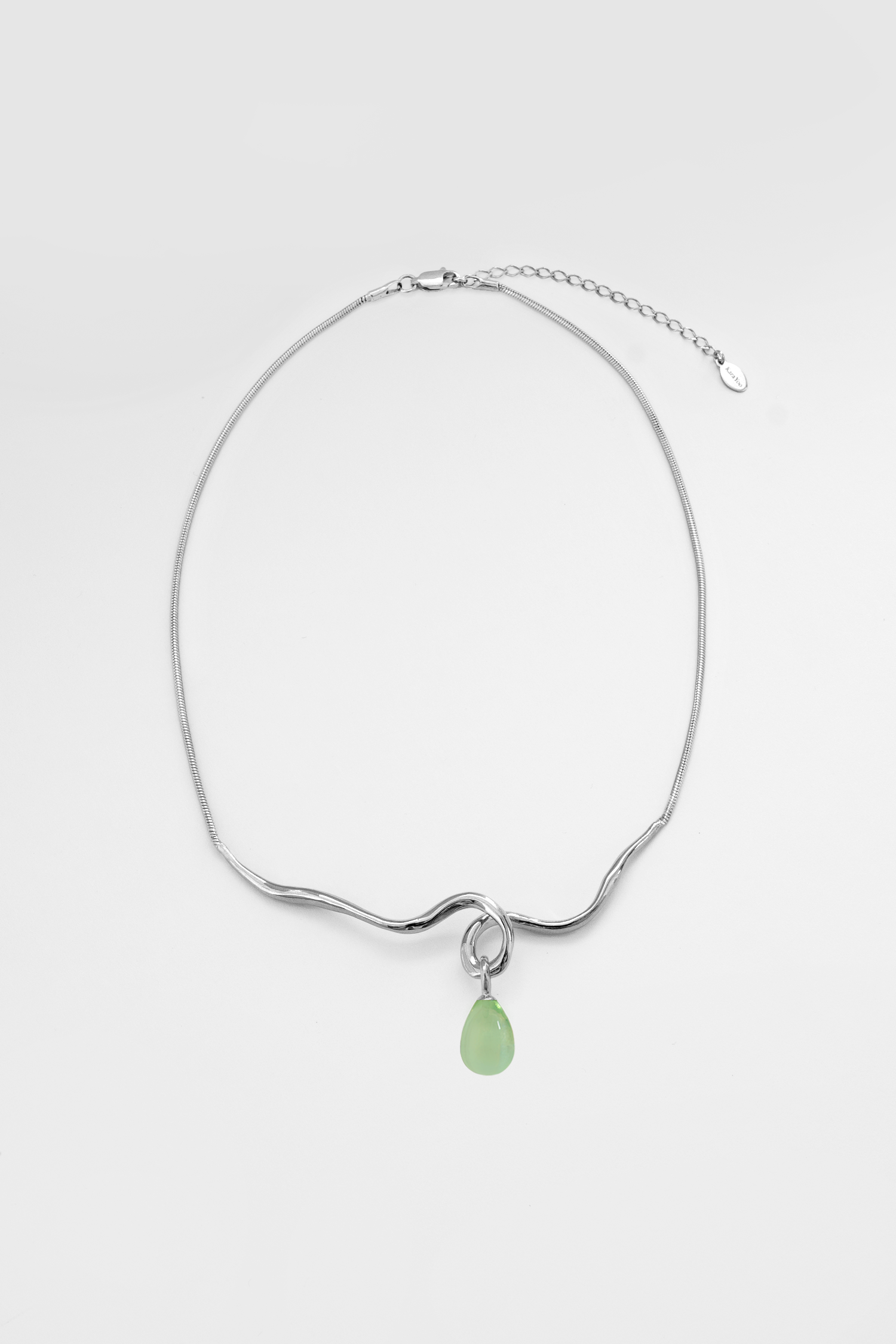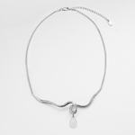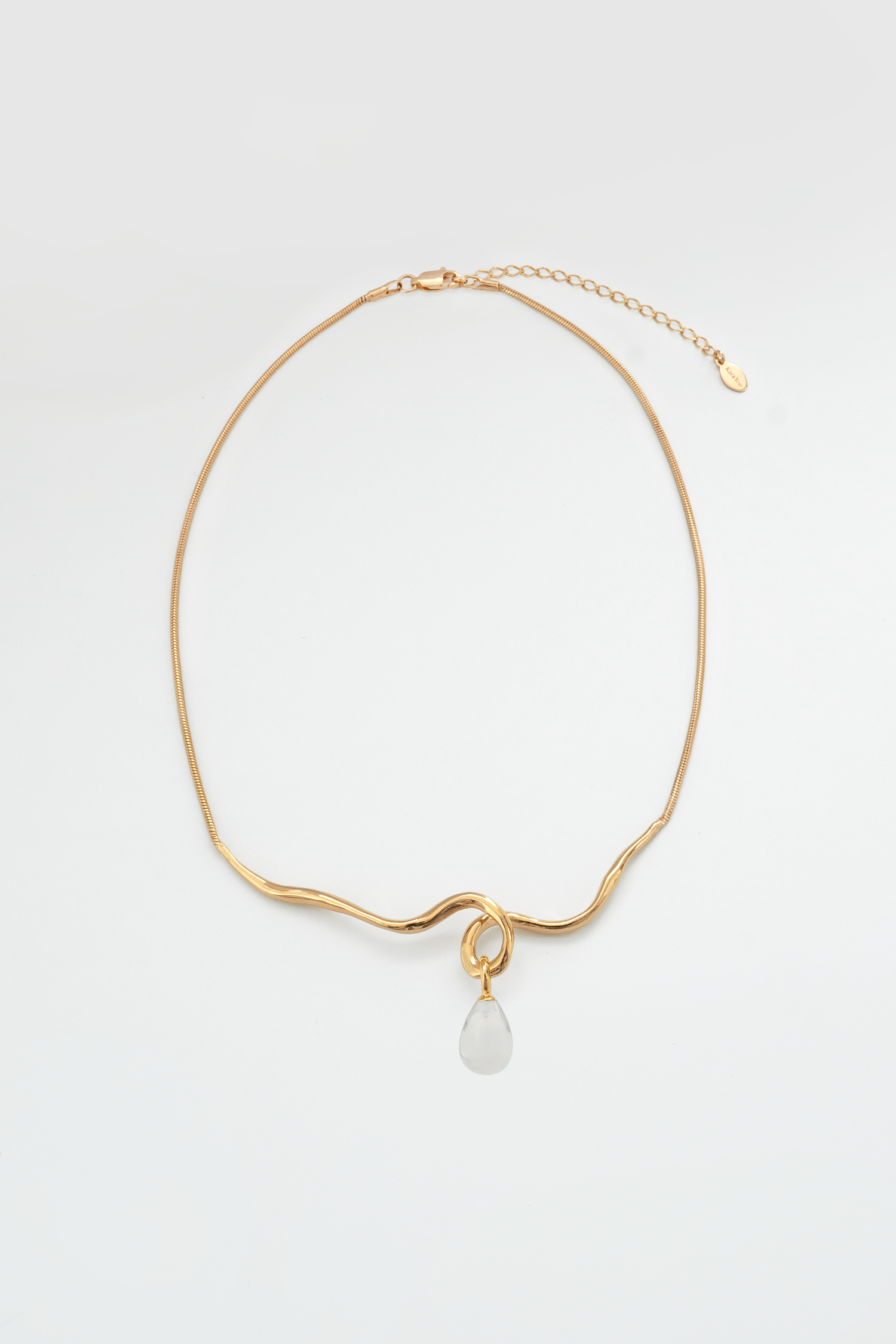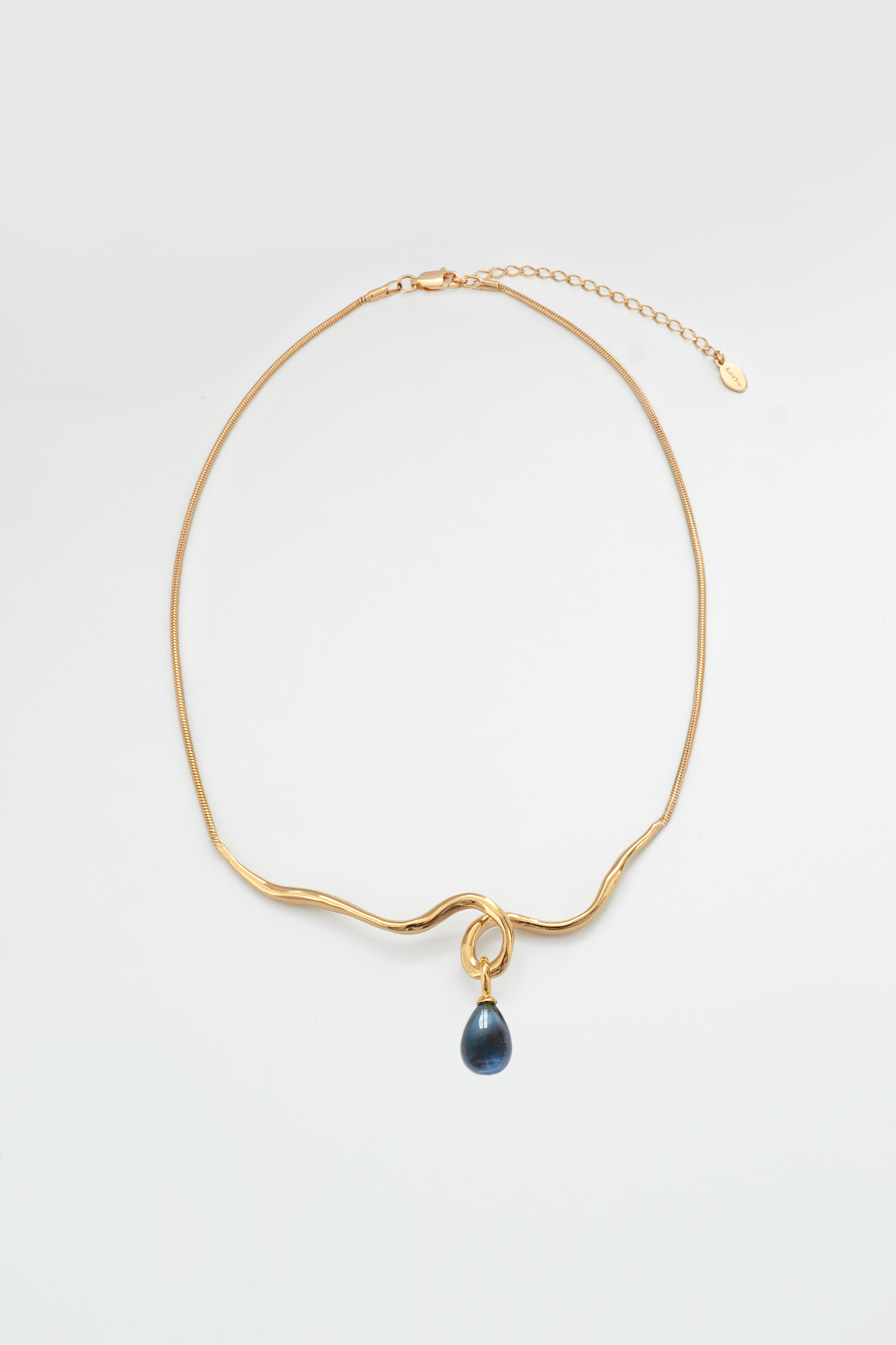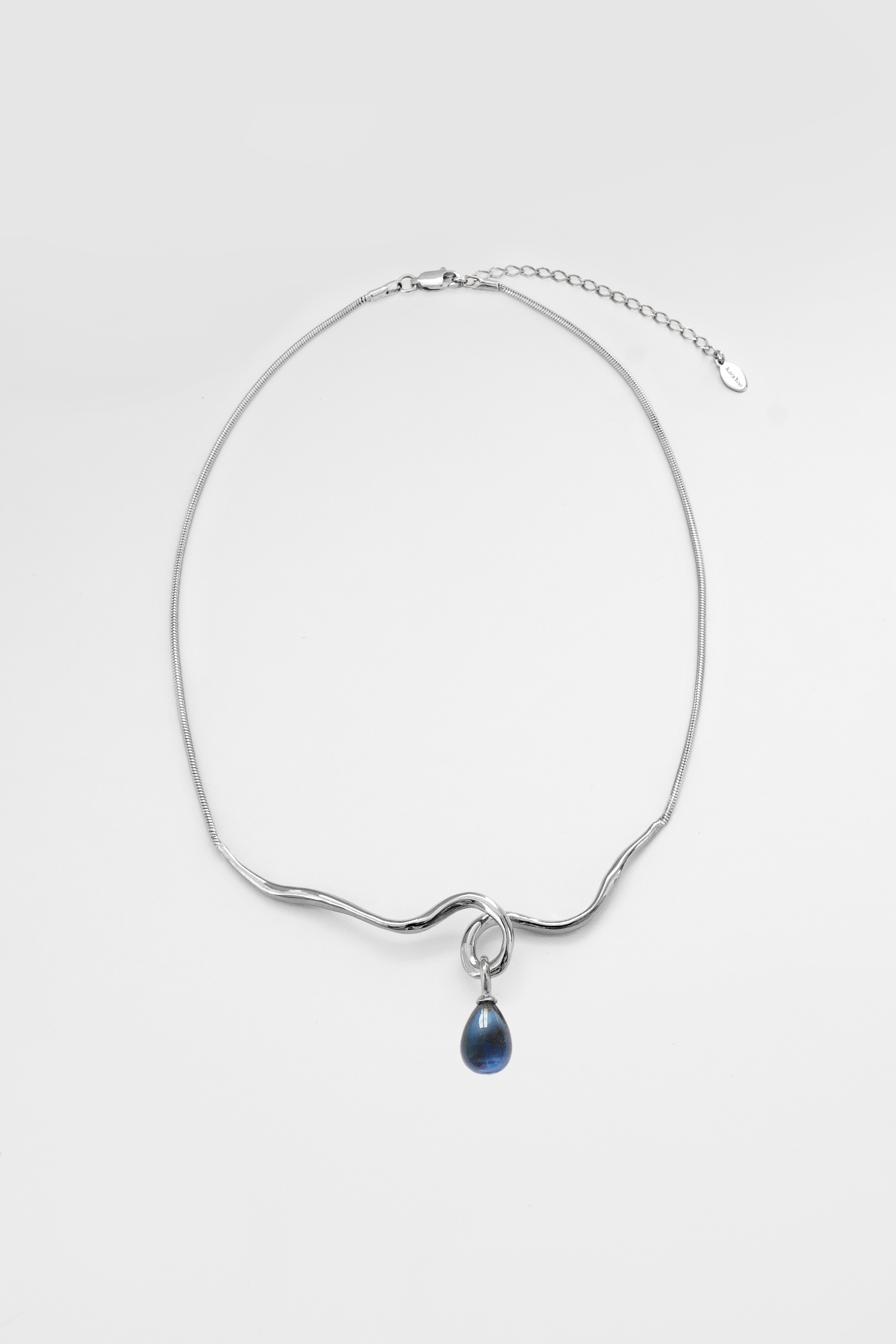 A loopy bar necklace that transitions seamlessly with a smooth snake chain. Comes with a small drop charm that slides directly onto the necklace (no hinged link necessary). Dimensions: 18” total length (16” long chain + 2” extender) 1.5mm wide snake chain 13mm x 9mm drop charm Materials: Sterling silver or 14K gold plated brass Glass drop bead Nickel-free + hypoallergenic Designed in Vancouver, crafted with our RJC-certified (Responsible Jewelry Council) partner in Thailand.