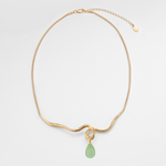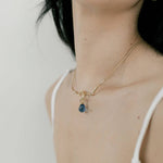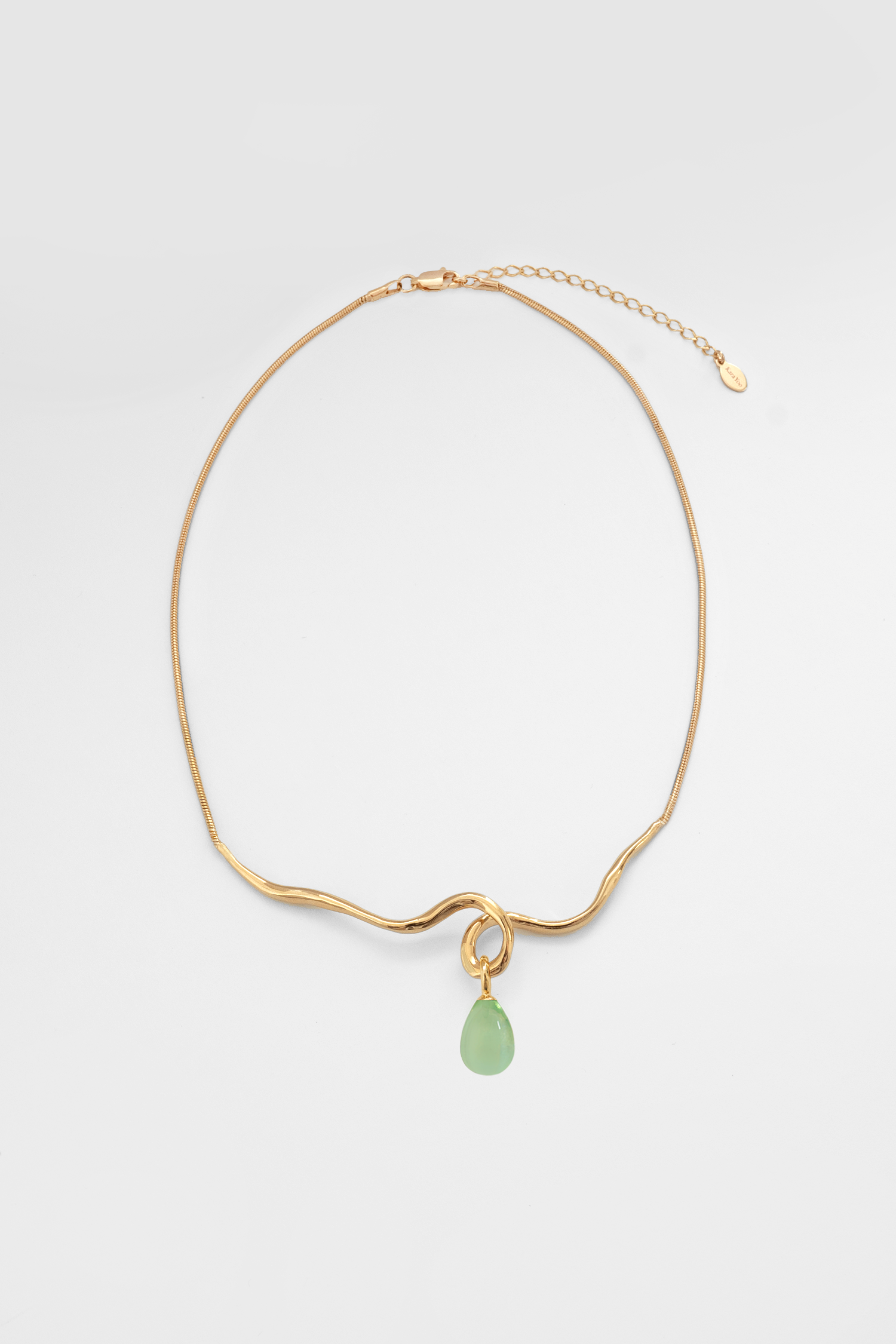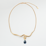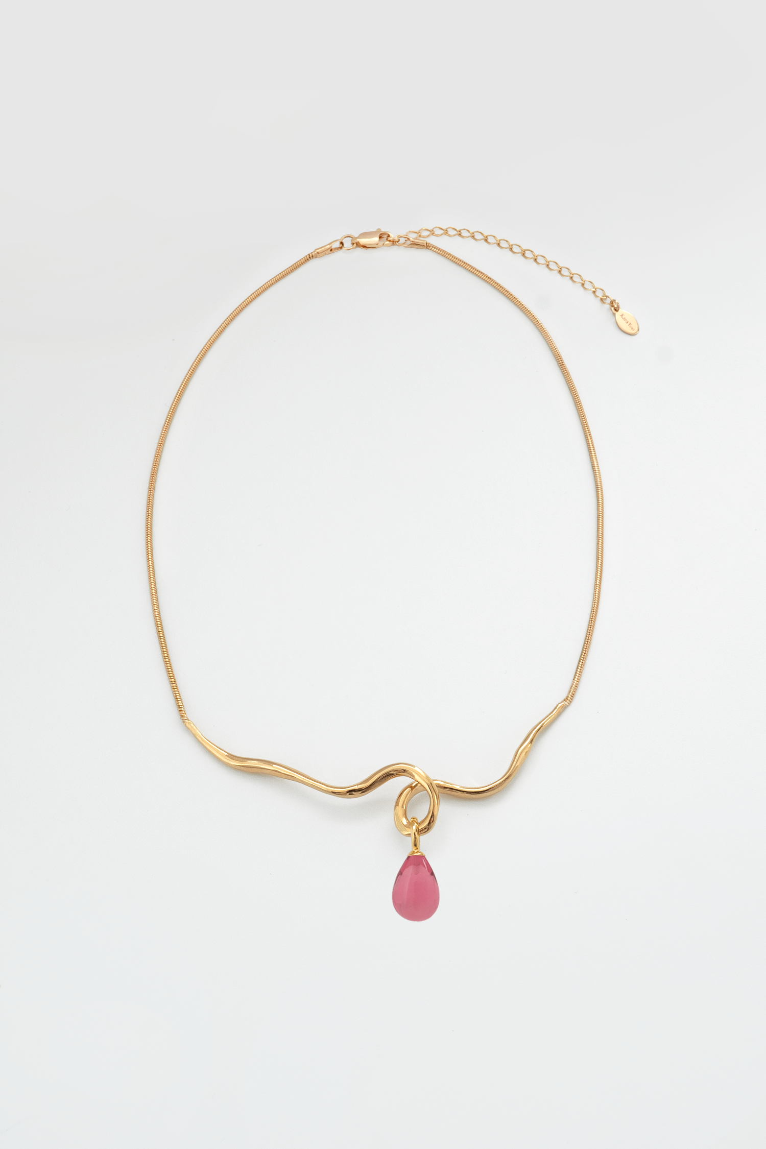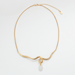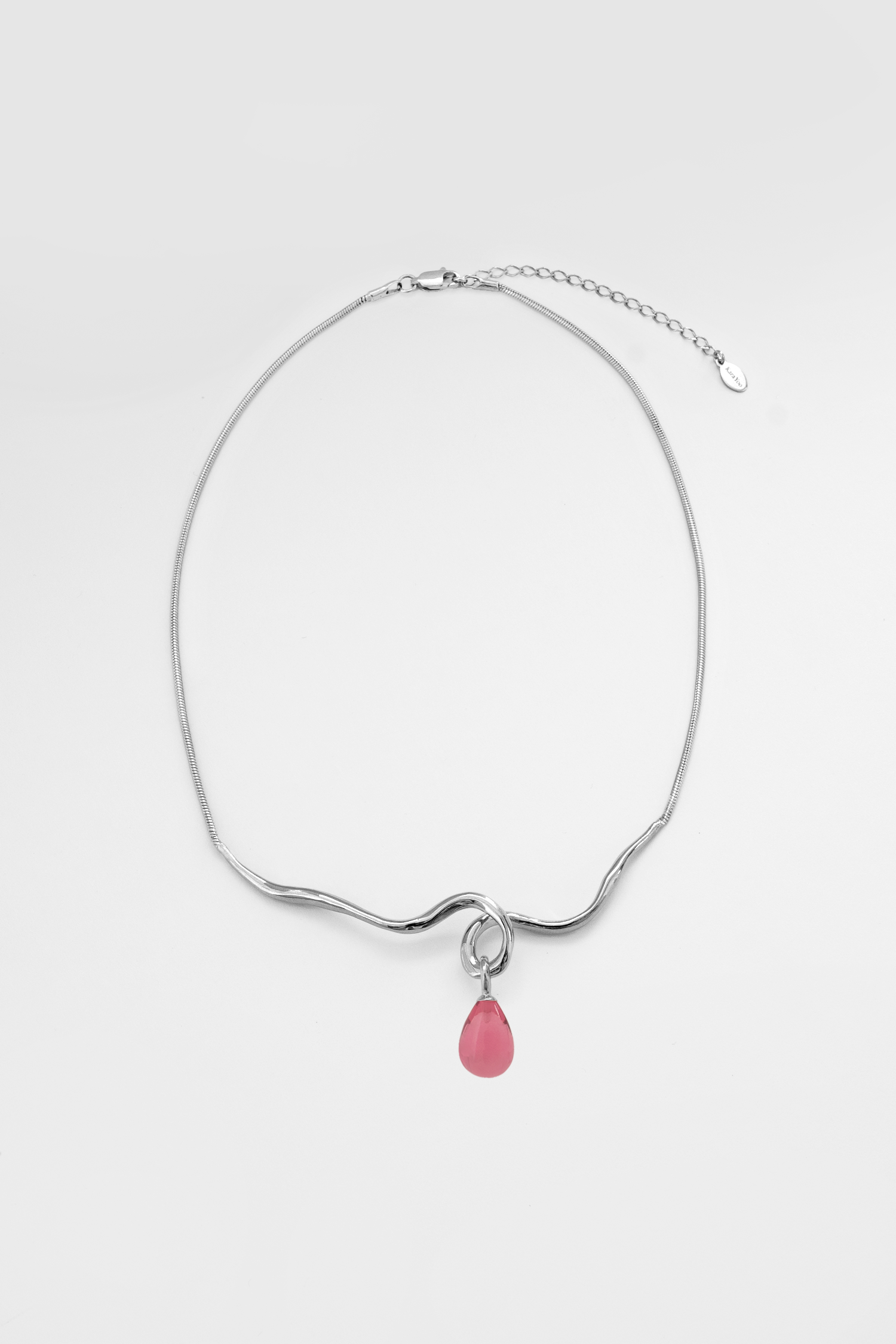 A loopy bar necklace that transitions seamlessly with a smooth snake chain. Comes with a small drop charm that slides directly onto the necklace (no hinged link necessary). Dimensions: 18” total length (16” long chain + 2” extender) 1.5mm wide snake chain 13mm x 9mm drop charm Materials: Sterling silver or 14K gold plated brass Glass drop bead Nickel-free + hypoallergenic Designed in Vancouver, crafted with our RJC-certified (Responsible Jewelry Council) partner in Thailand.