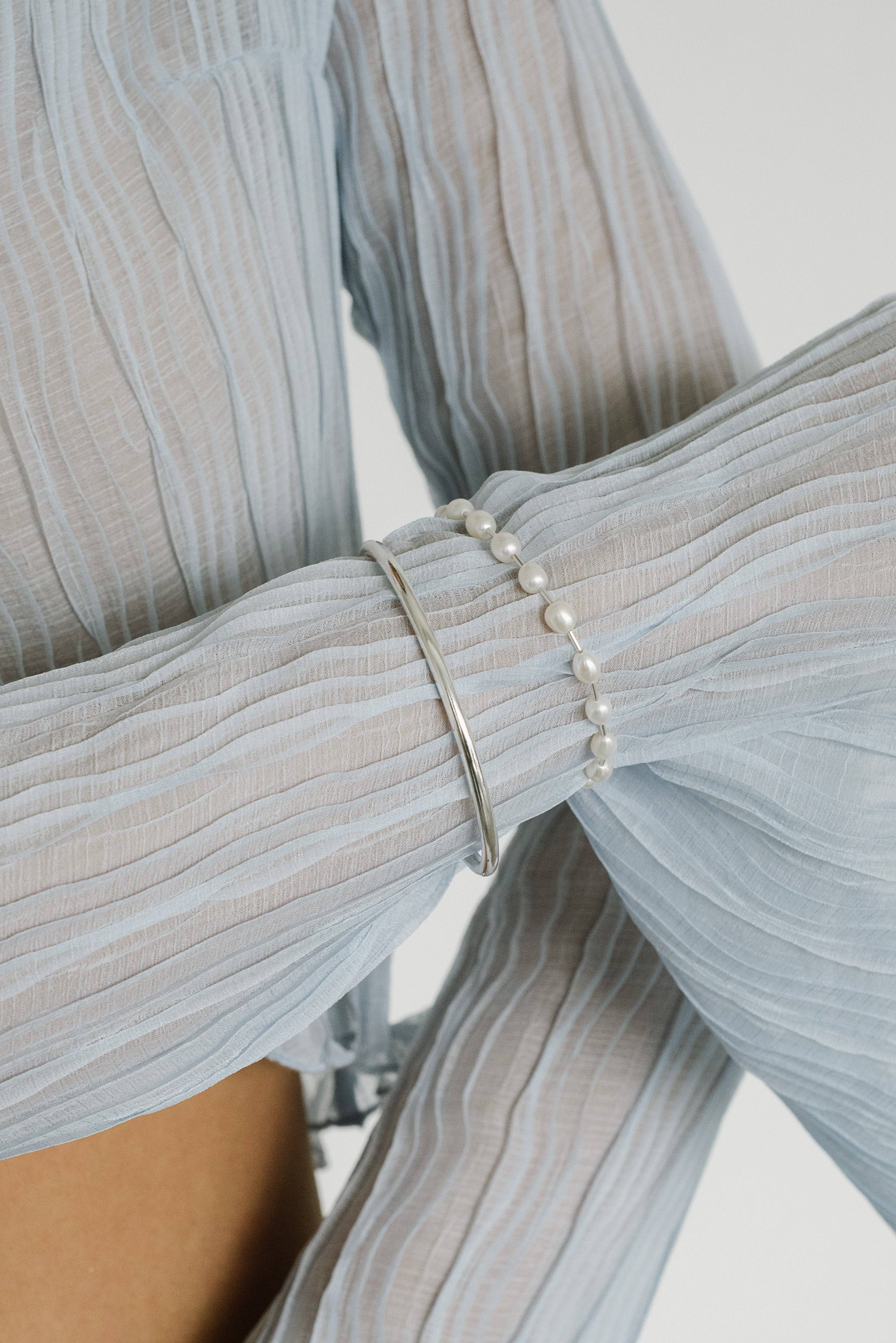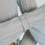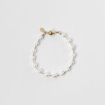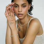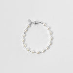 Freshwater rice pearls and tube beads are constructed to mimic a ball chain.