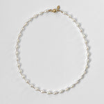 Freshwater rice pearls and tube beads are constructed to mimic a ball chain.