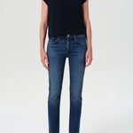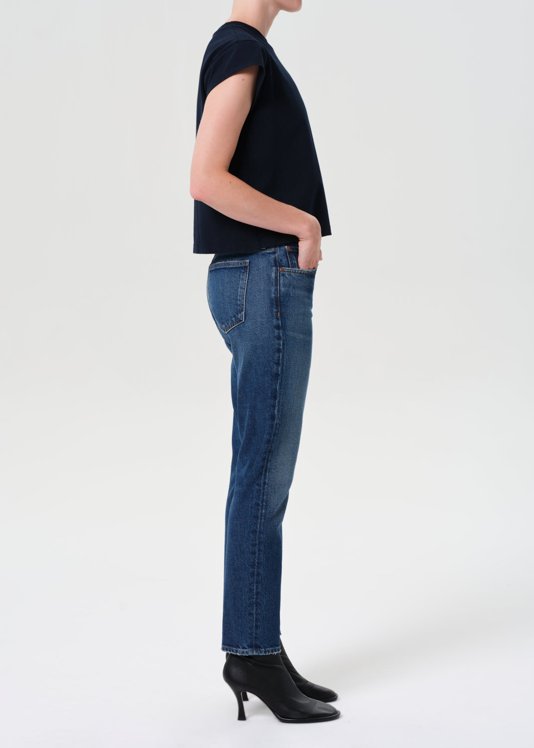 The Cocktail Ankle Jean is a slim, ankle-length pant in dark red cast indigo denim. Crafted from comfort-stretch regenerative cotton with a super-soft hand, it offers a sleek, true-to-size silhouette. Fading, marbling, and whiskering details add subtle character, making it perfect for pairing with fitted tops or layering under oversized knits for a modern, versatile look.