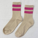 A bold varsity stripe is timeless and always a classic. Her Varsity Socks is a varsity striped version of our OG Her Socks which are classically ribbed, perfect height, cotton blend durable, chic go to socks. Add an understated sporty touch to any look with this bold stripe contrast version of Her Socks. She loves to be worn with a mini skirt, plaids, and oversized cable knit sweaters. Made in South Korea Contents: 80 Cotton 18 Poly 2 spandex Sizing: One size fits most (US women's size 6-10) Care Instructions: Machine wash cold Tumble dry low Do not iron Do not bleach