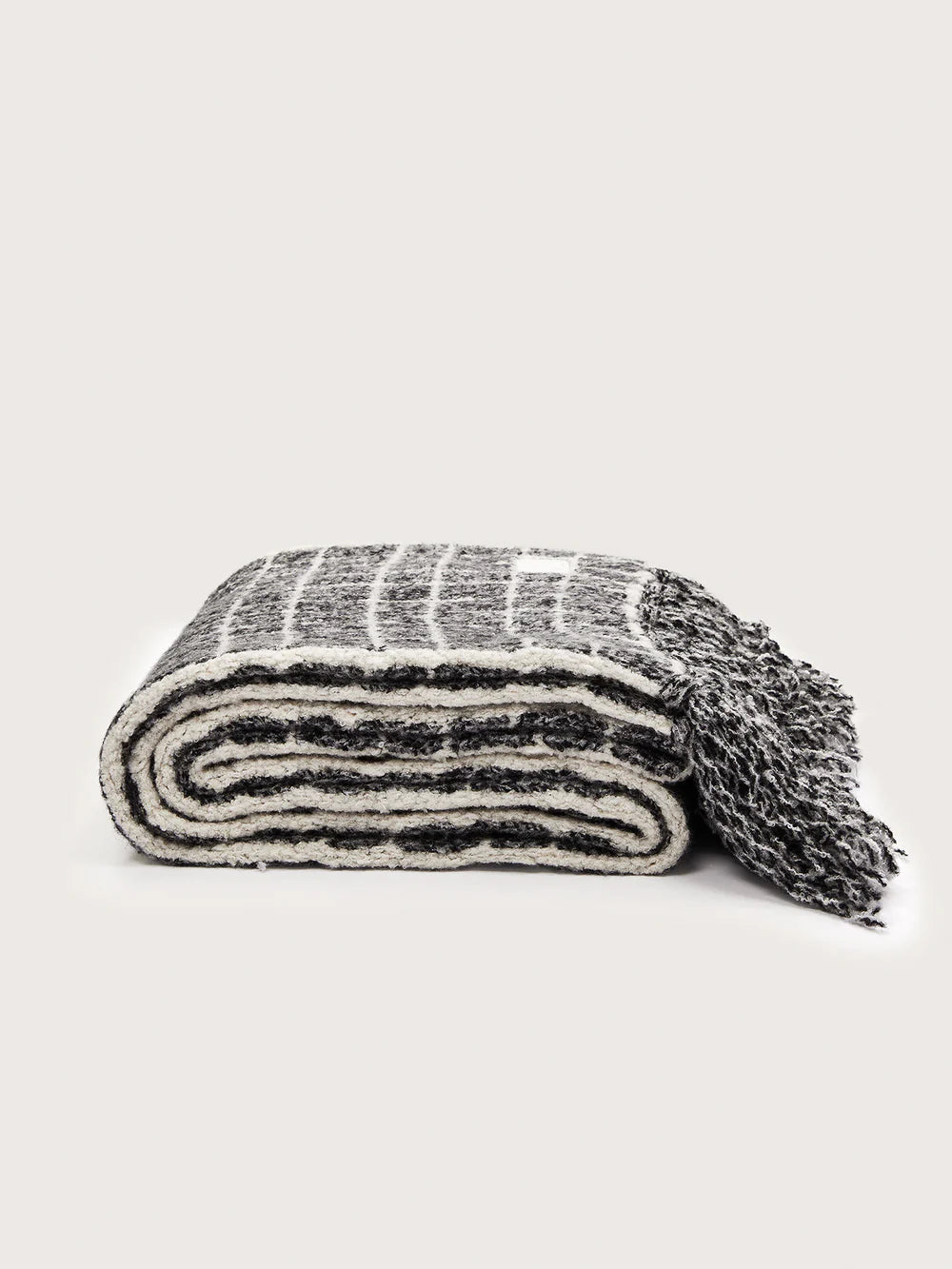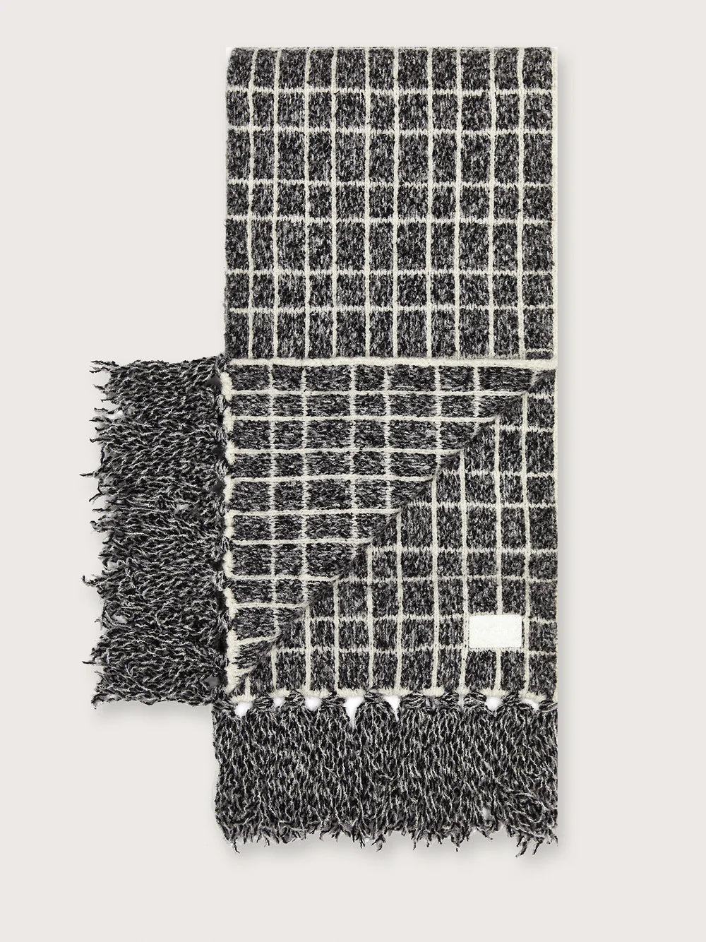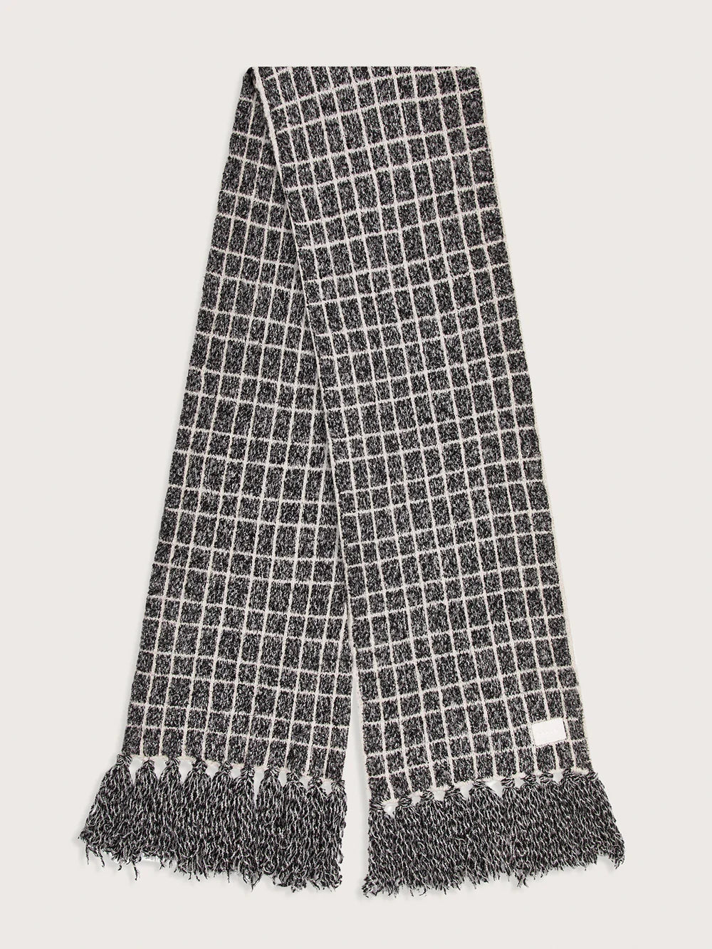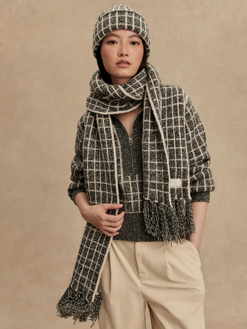 Wrap up in the Lindsey scarf to stay warm and chic through the colder months. Crafted from a Cotton Viscose Plush Bouclé yarn in a checkered pattern with fringe details, the Lindsey has a soft, elevated texture - made to match the Furley half-zip knit and Noel beanie. Style together for a coordinated look or wear solo as a statement accent.
