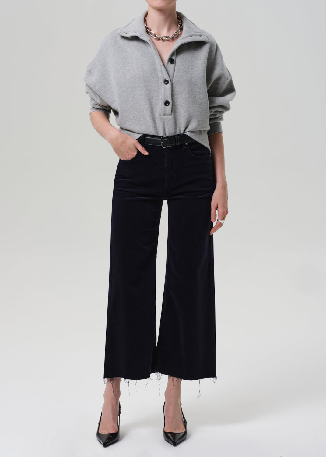 The Lyra is a vintage-inspired wide leg that sits high on the waist with a relaxed top block and cropped inseam for a voluminous, modern shape. Cut in soft stretch baby corduroy, the deep navy hue offers a refined take on texture—ideal with crisp shirting or slouchy knits.