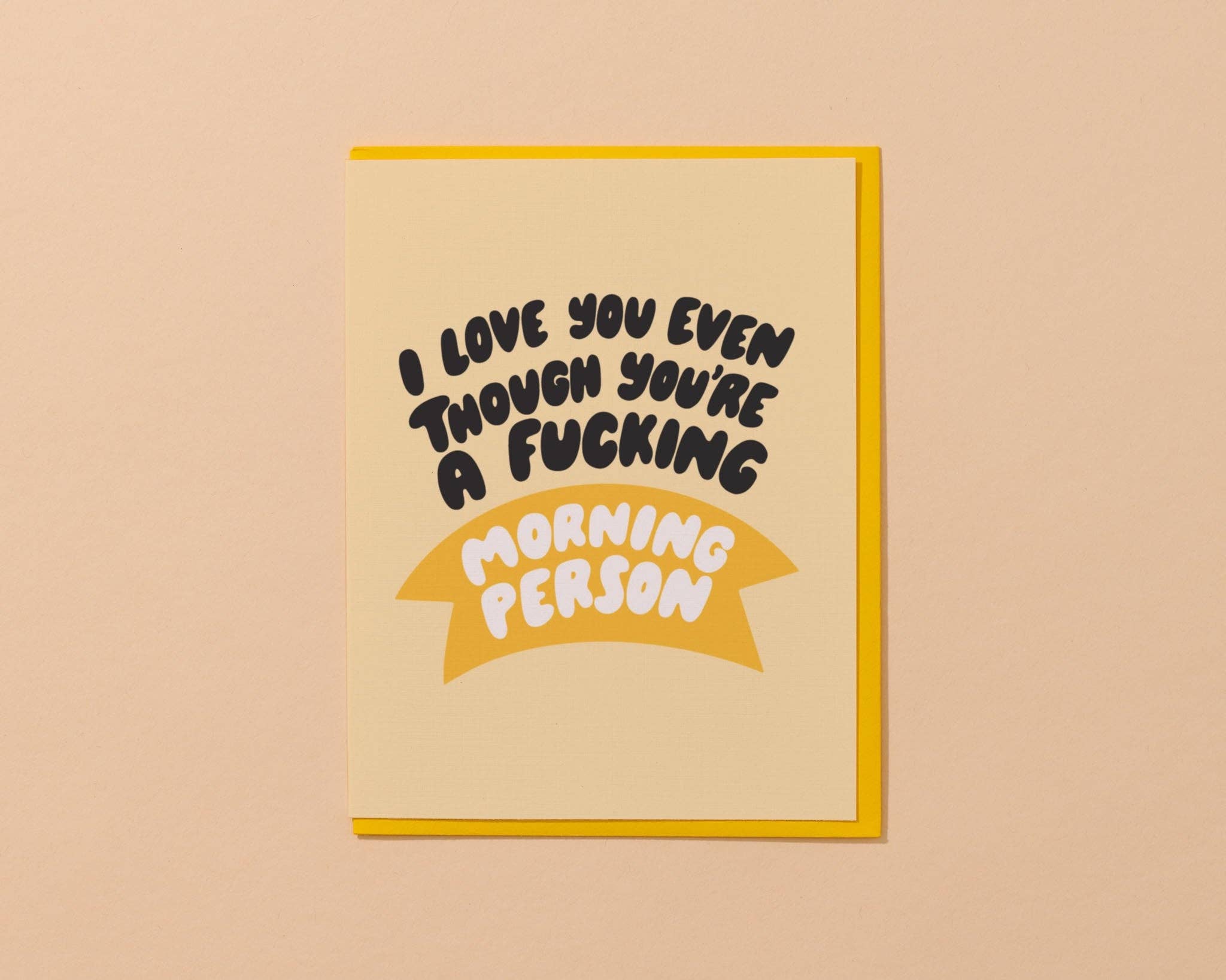 Card reads, “I love you even though you're a fuckin' morning person”