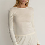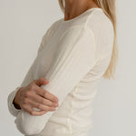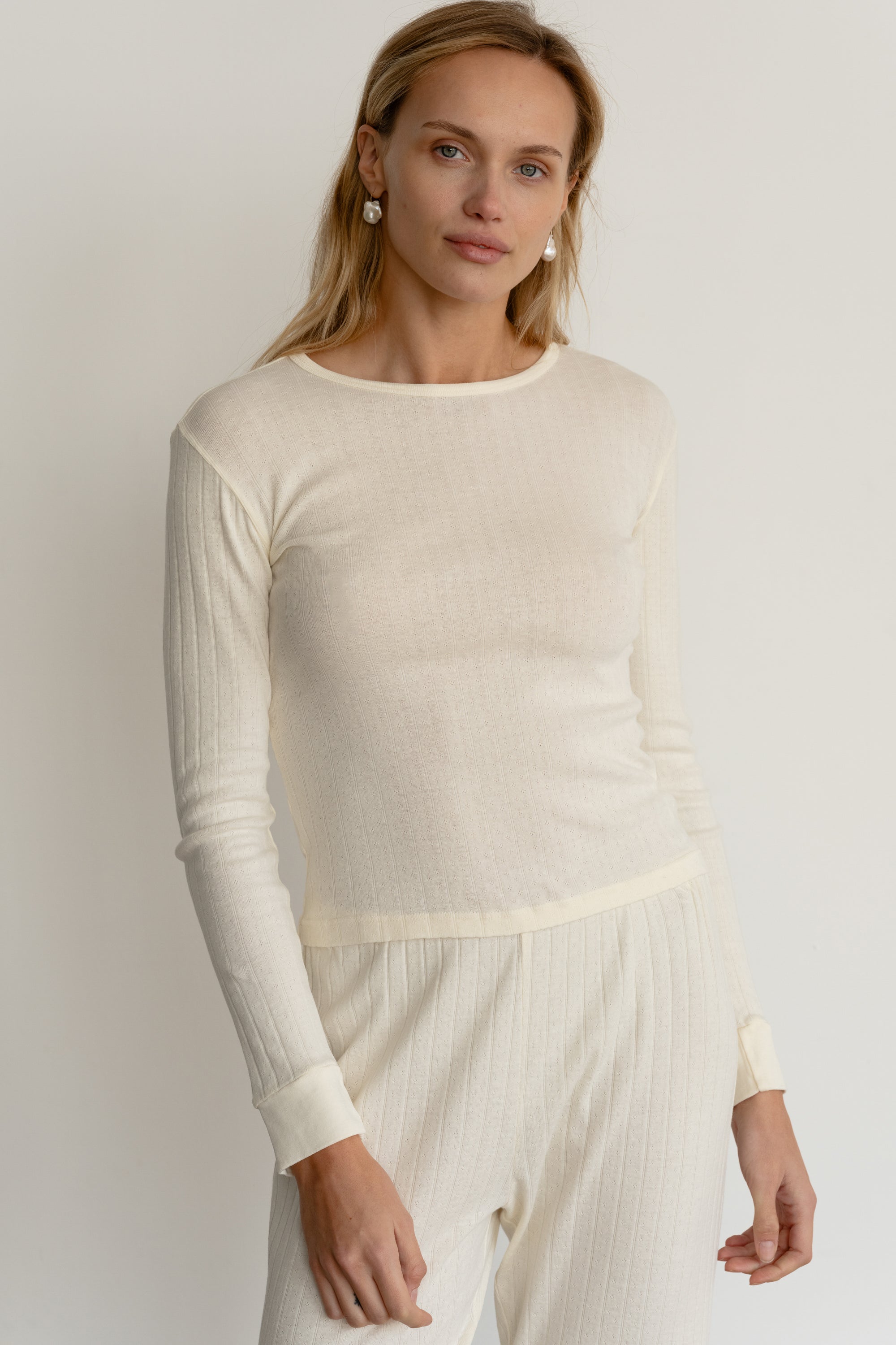 Refined yet effortless, The Pointelle Long Sleeve is crafted from lightweight 100% organic cotton. Featuring a timeless pointelle knit, crew neckline, and baby rib cuffs, it skims the body with a flattering drape—perfect for year-round layering.