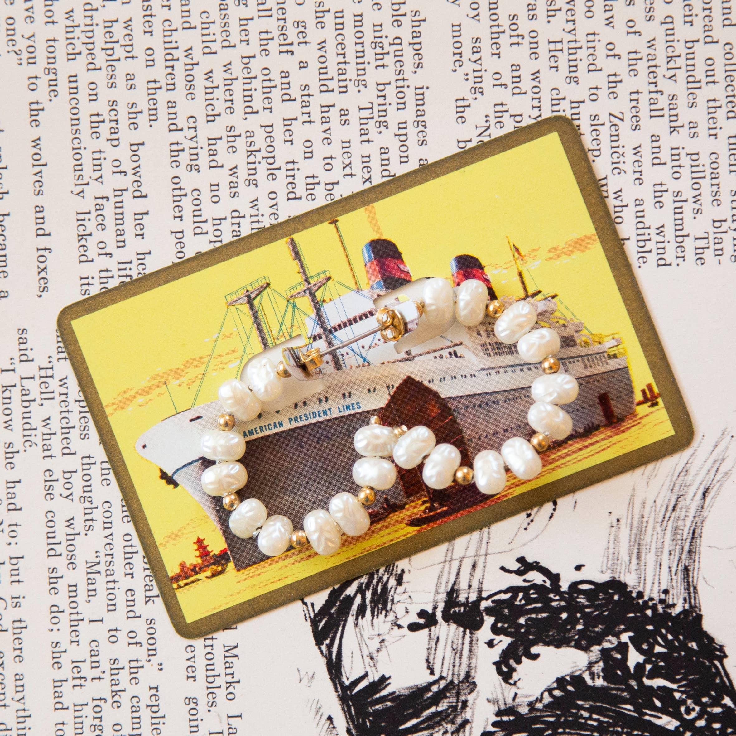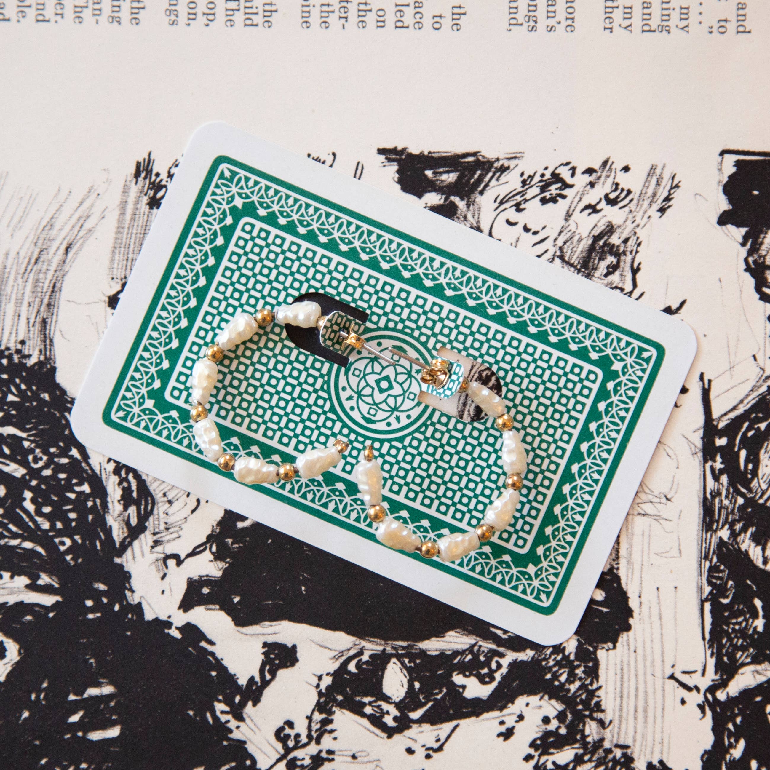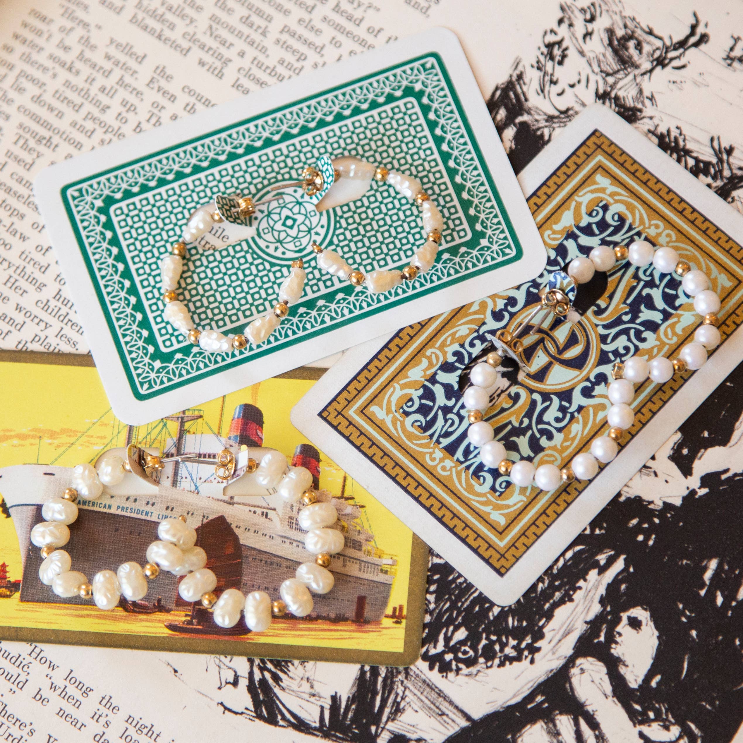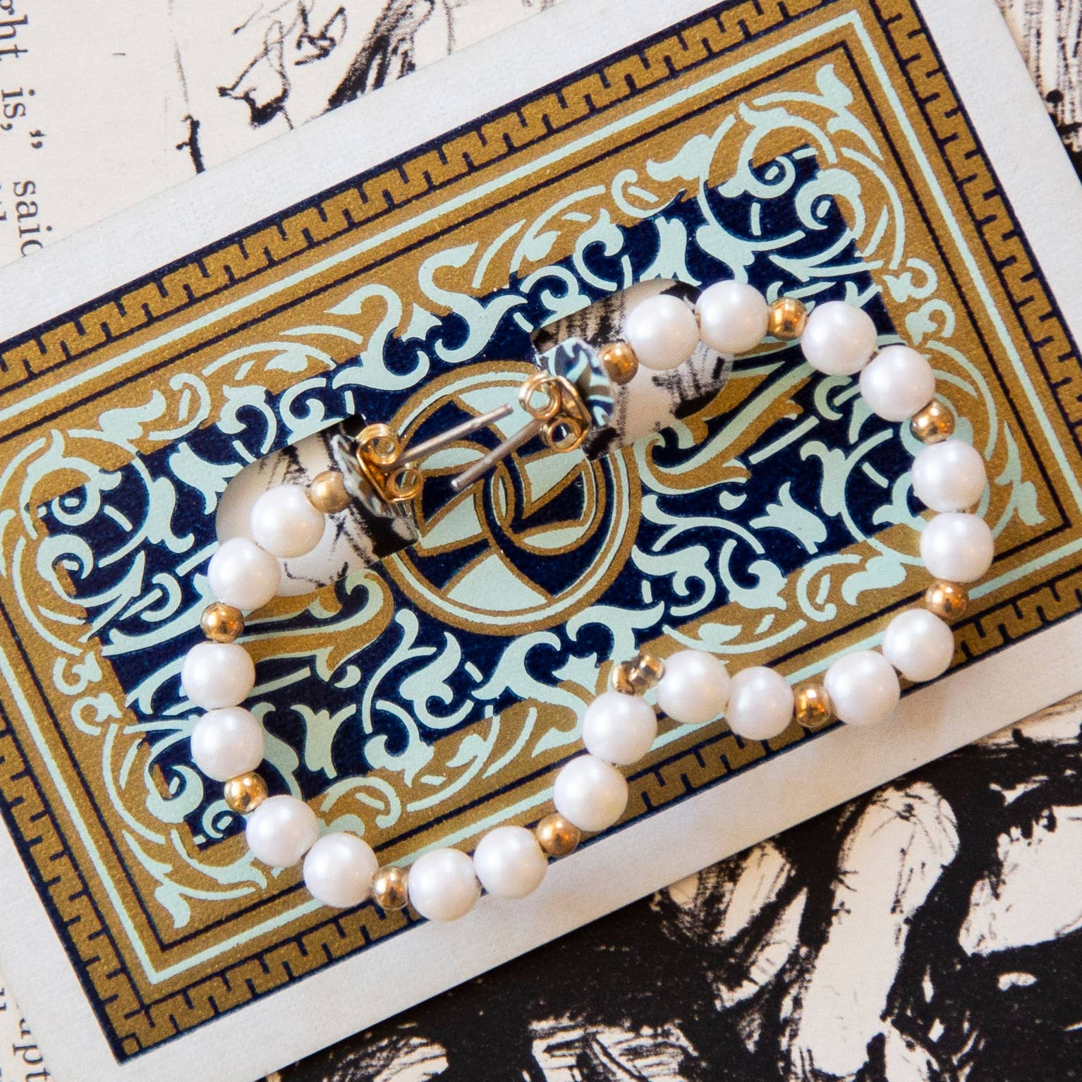 Deadstock vintage acrylic pearls beaded into hoops in a set of three different styles. Minimum of 3 hoops. Made in Korea. They will come carded on mini playing cards with our branding, unless you request otherwise before shipping. Playing cards vary. Each individual hoop sells for $9 wholesale, $18 MSRP.
